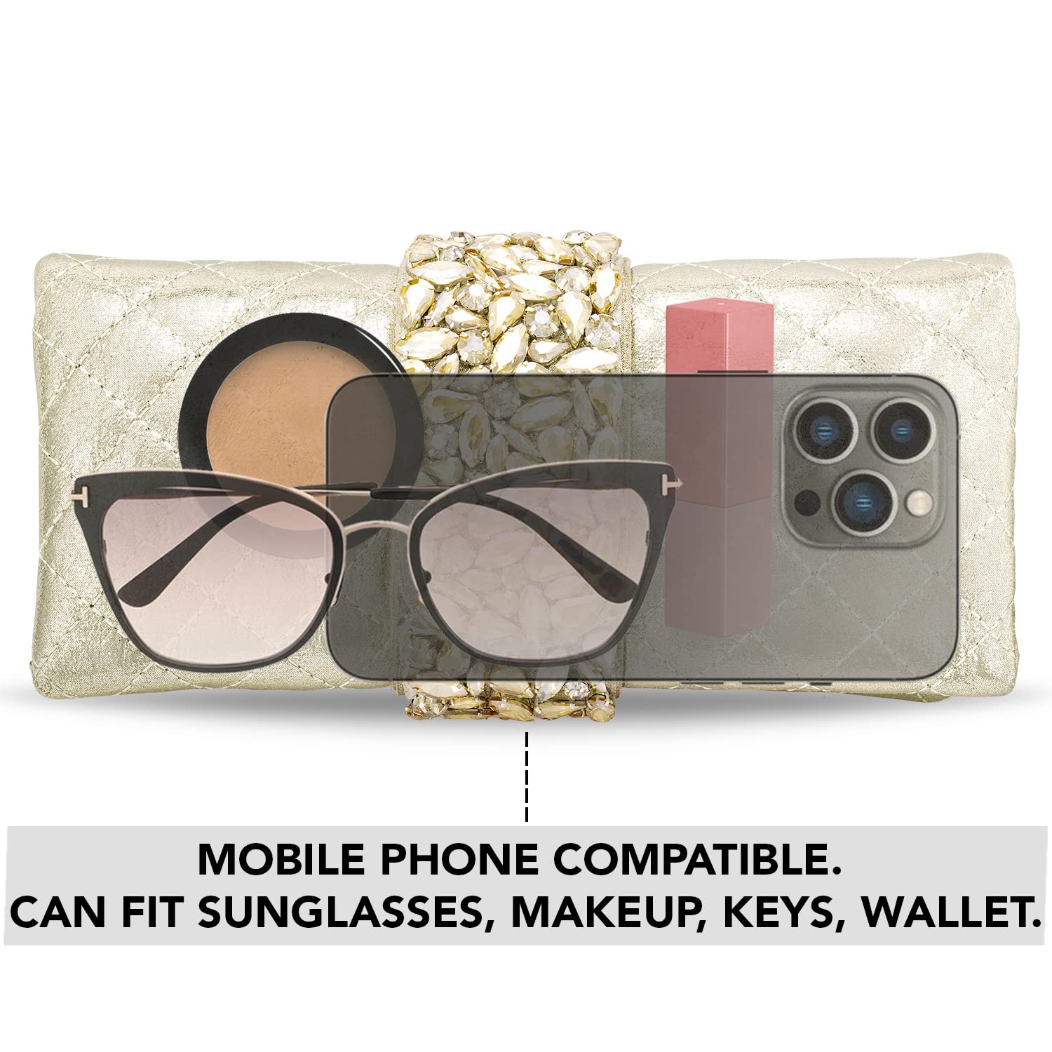 - DESIGN: Embellished with Indian hand work, the soft fabric interior of the evening bag has enough room to keep your credit card, cash, and other small essentials like mobile phones, lipstick, highlighter, keys.