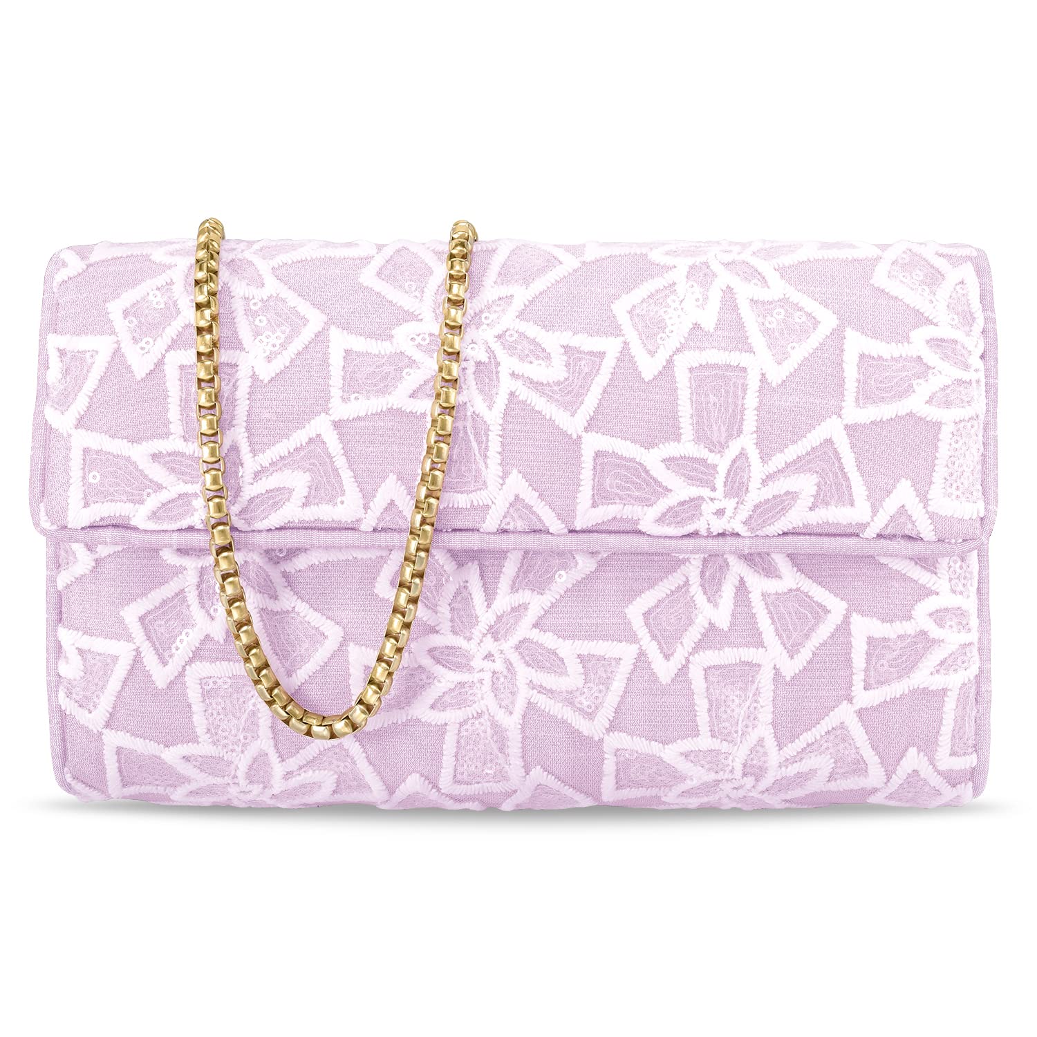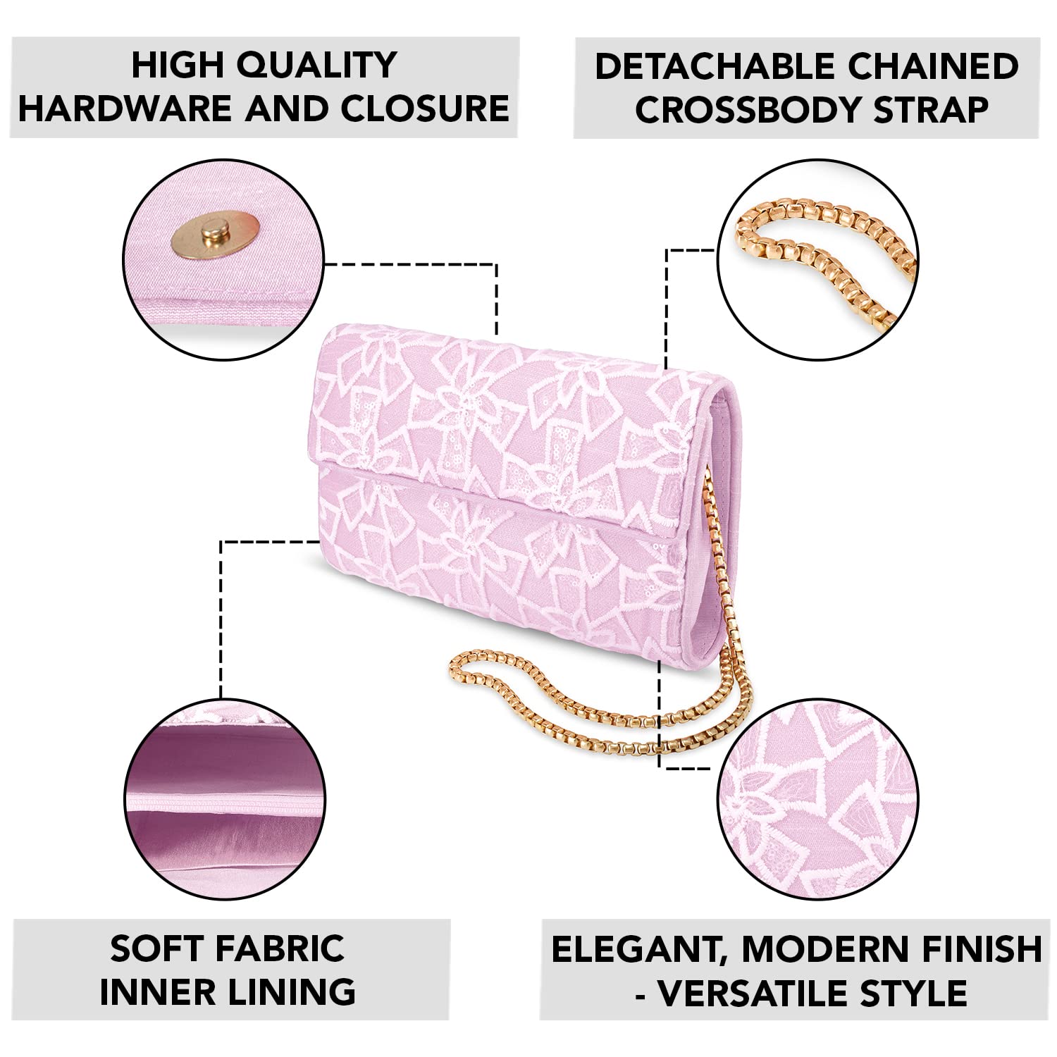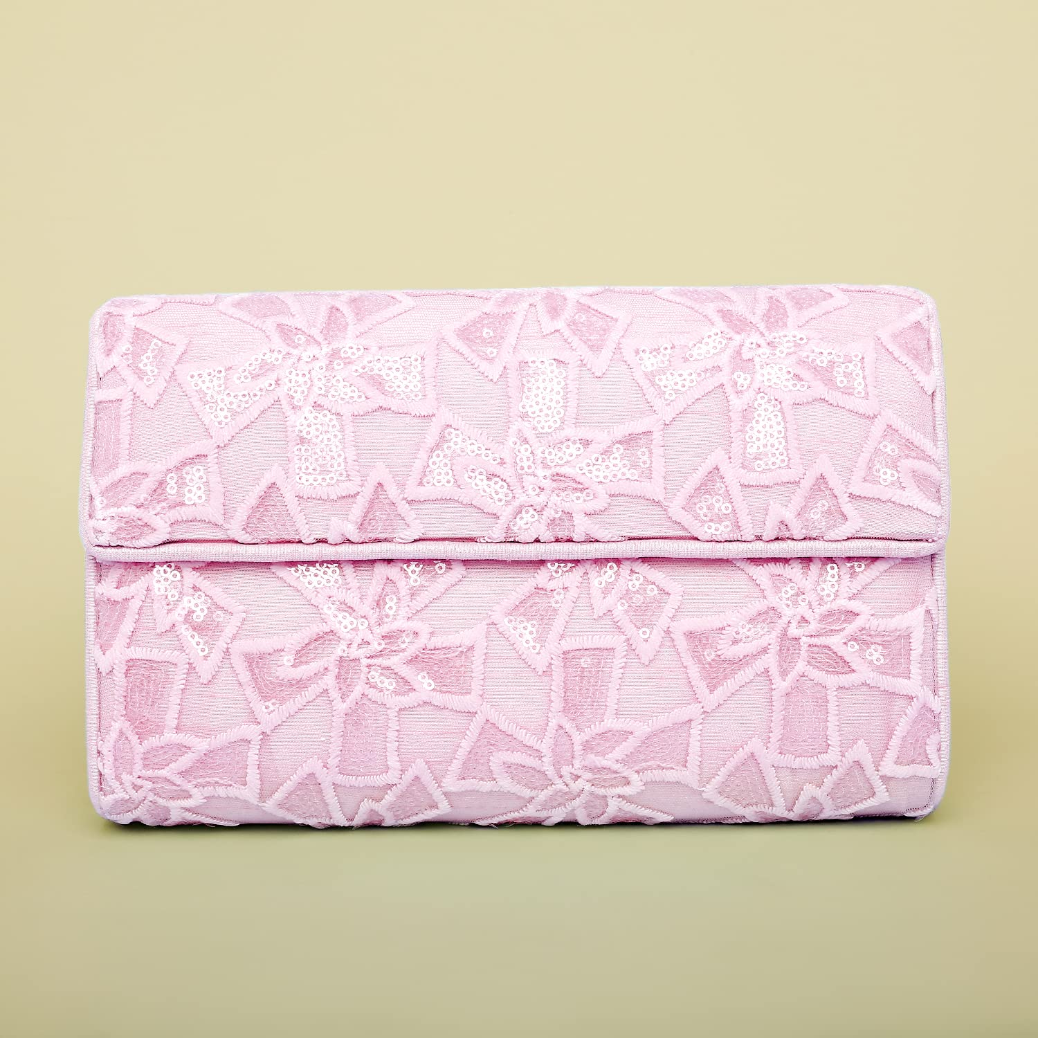 - KEY FEATURES : Clutch Dimension:- L - 9.44 Inch x W - 2.16 Inch x H - 5.59 Inch, Weight- 380 Grams | Type:- Envelope | Color:- Pink | Size:- Regular | Material:- Fabric