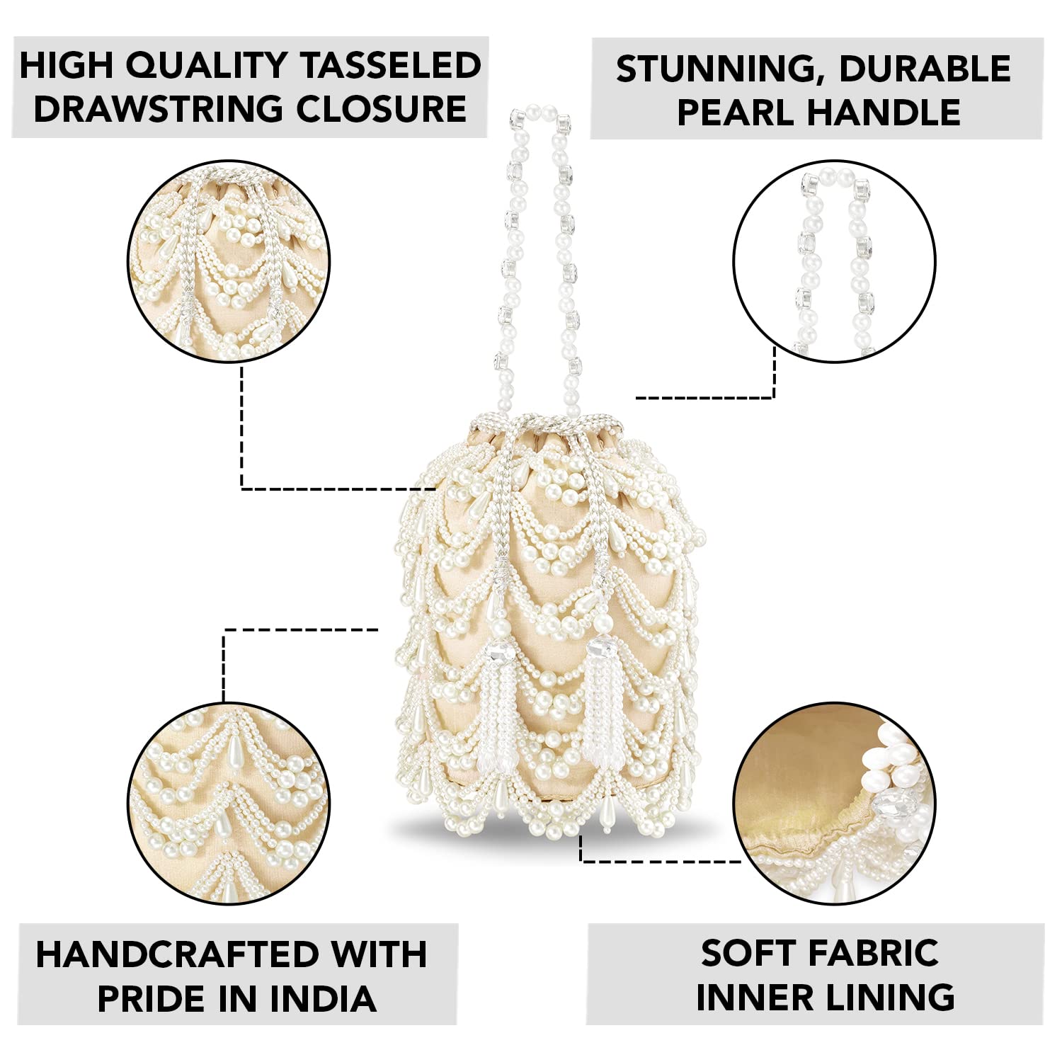 - KEY FEATURES : Potli Bag Dimension:- L - 7.87 Inch x W - 5.51 Inch x H - 7.48 Inches, Weight- 300 Grams | Type:- Drawstring | Color:- Cream | Size:- Regular | Material:- Fabric