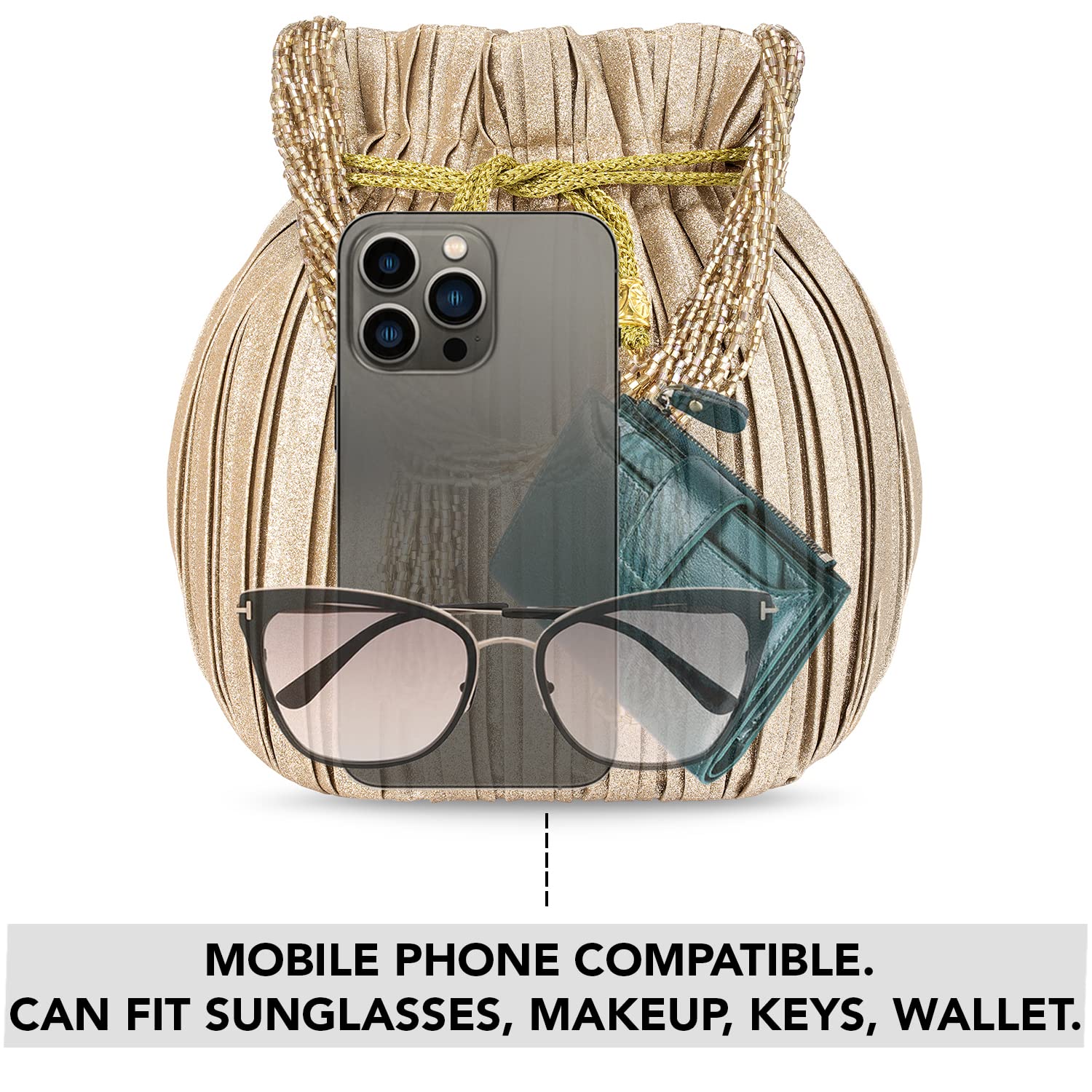 - DESIGN: Embellished with Indian hand work, the soft fabric interior of the evening bag has enough room to keep your credit card, cash, and other small essentials like mobile phones, lipstick, highlighter, keys. The beaded bag comes with tassel dori drawstring and pearl handle.