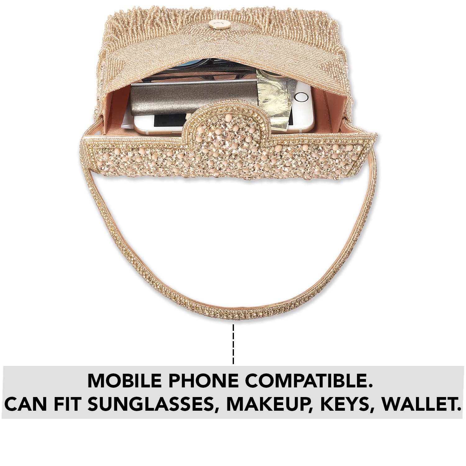 - DESIGN: Embellished with Indian hand work, the soft fabric interior of the evening bag has enough room to keep your credit card, cash, and other small essentials like mobile phones, lipstick, highlighter, keys.