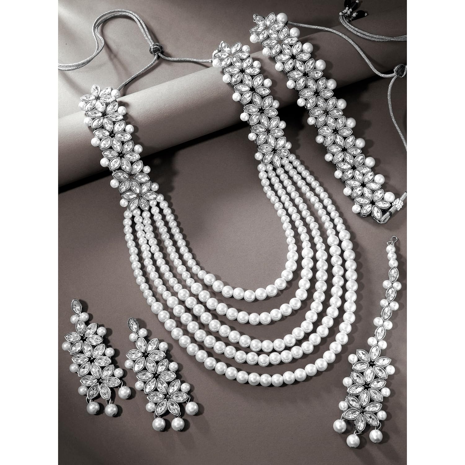 Peora Silver Plated Crystal & Beads Studded Bridal Short & Long Necklace Earrings Maangtikka Jewellery Set for Women