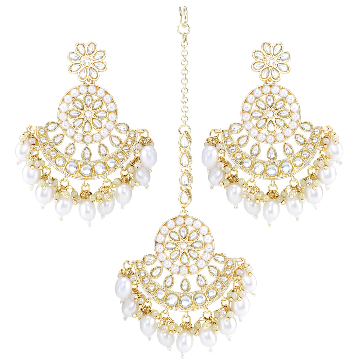 Peora Traditional Gold Plated White Kundan & Pearl Dangle Earrings & Maang Tikka Ethnic Stylish Jewellery Set Gifts for Women & Girls