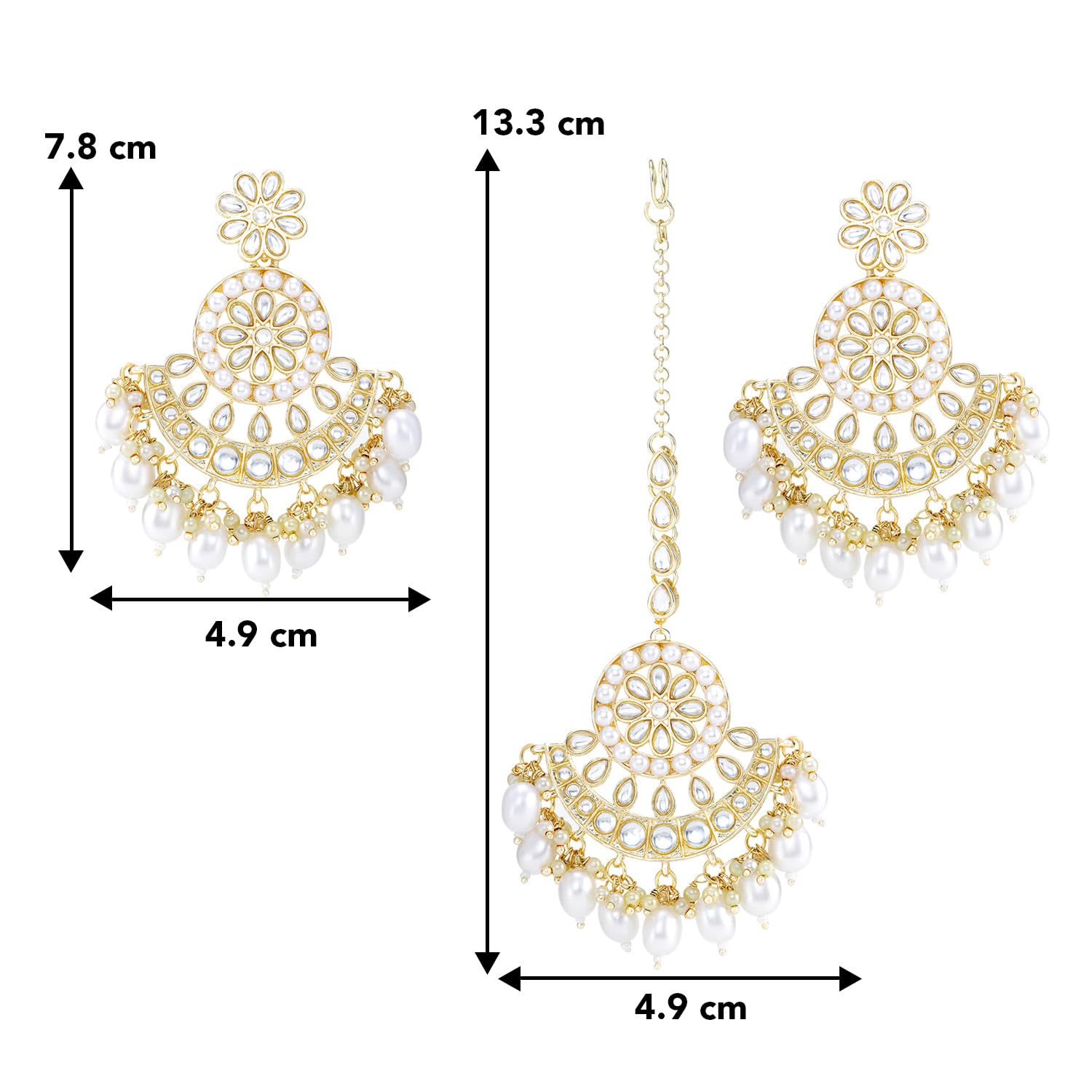 - Dimensions : Earring Height: 7.8 cm x Width: 4.9 cm ,Maang Tikka Length: 13.3 cm x Width: 4.9 cm , Weight: 56.6 Grams