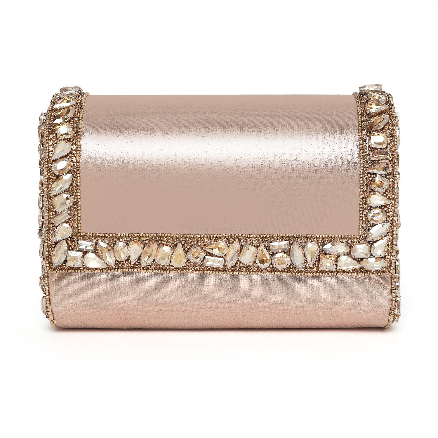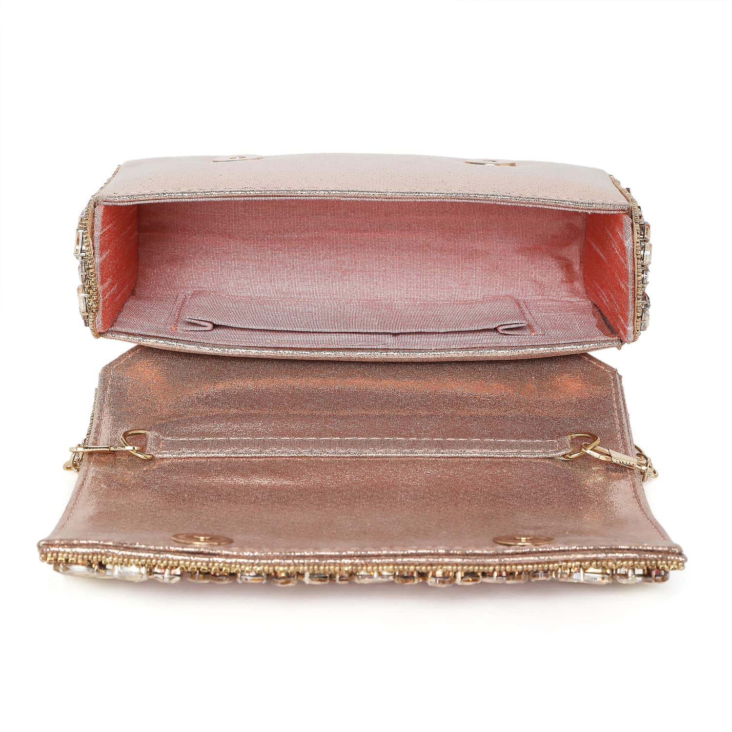 - KEY FEATURES : Wedding Clutch Dimension:- L - 7 Inch x W - 2.44 Inch x H - 4.72 Inch, Weight - 384.77 Grams | Type:- Envelope | Color:- Rose Gold | Size:- Regular | Material:- Fabric