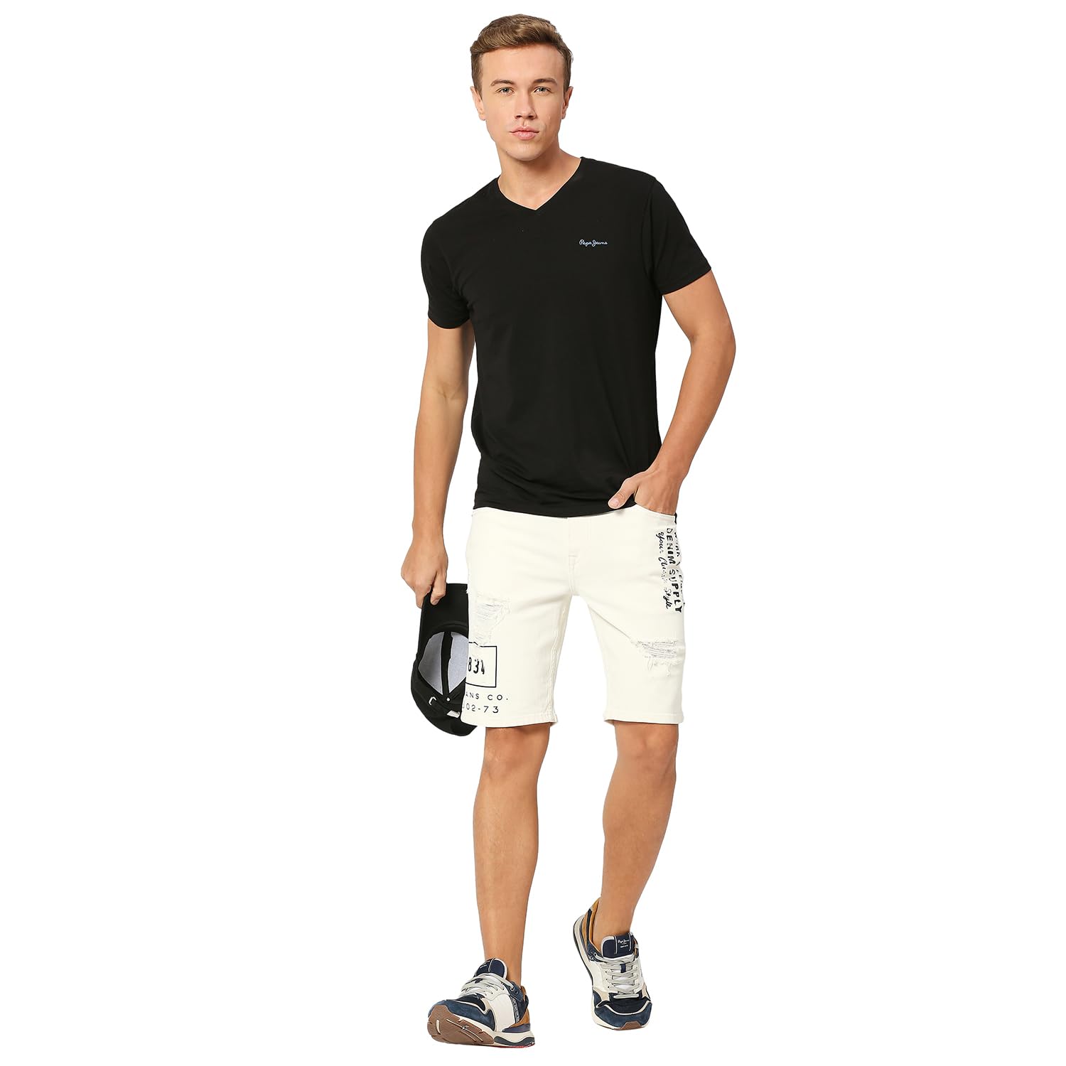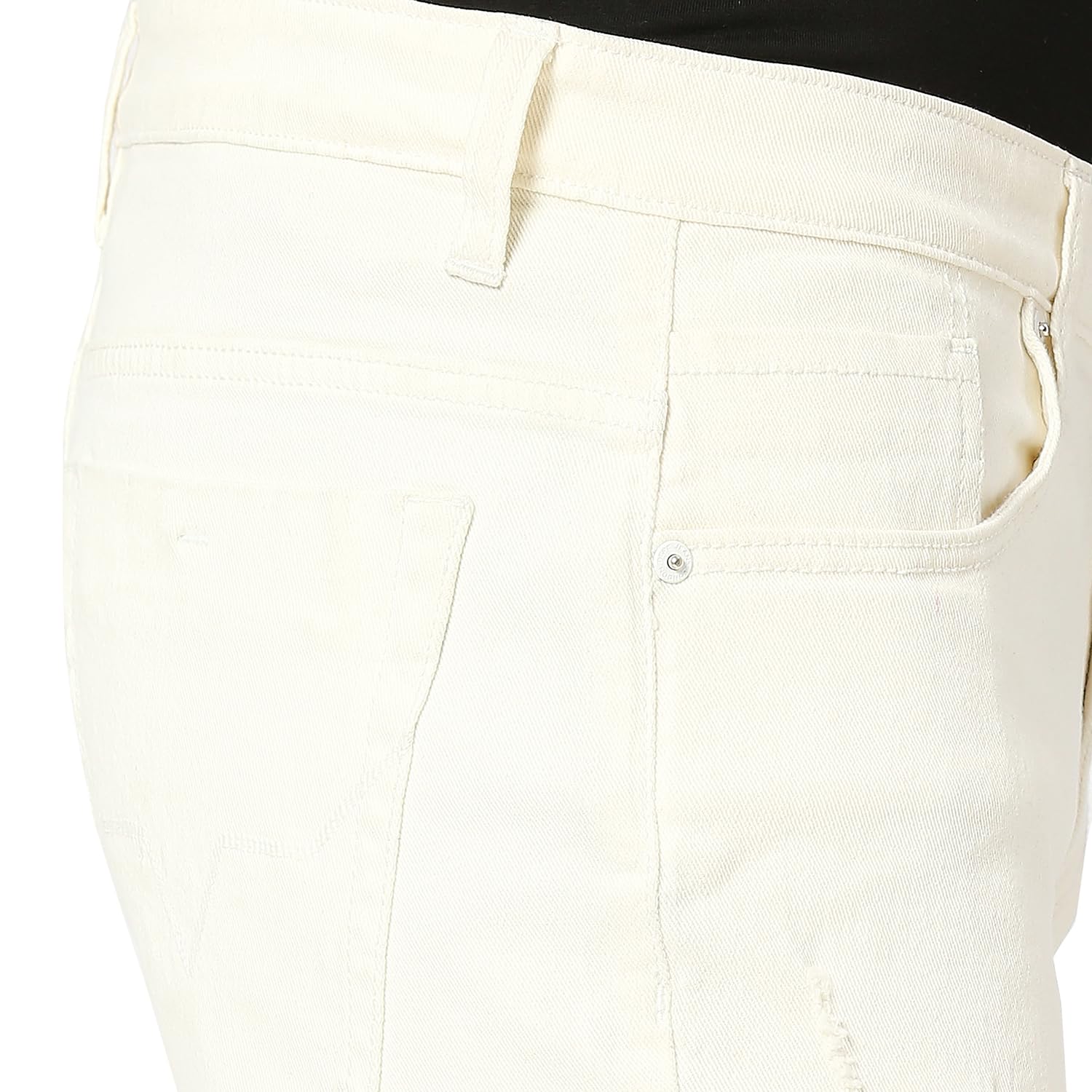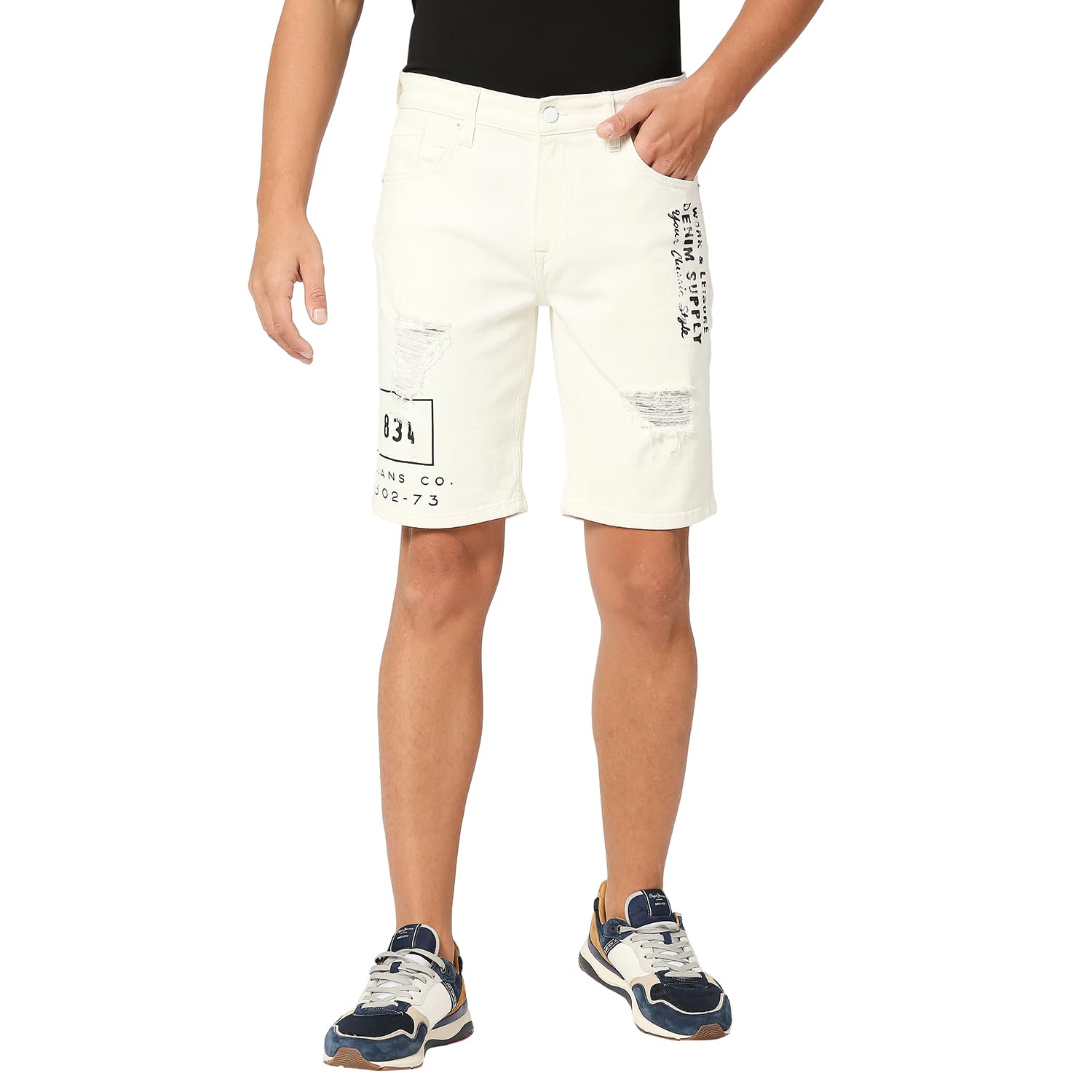 Details: 73 Fashion- Signature Brand Carrier - Stylized 5 Pocket 3/1 Twill- White Regular Fit-Mid Rise denim Shorts, Non Faded Denim With A Trendy Destruction Look & Print Detail