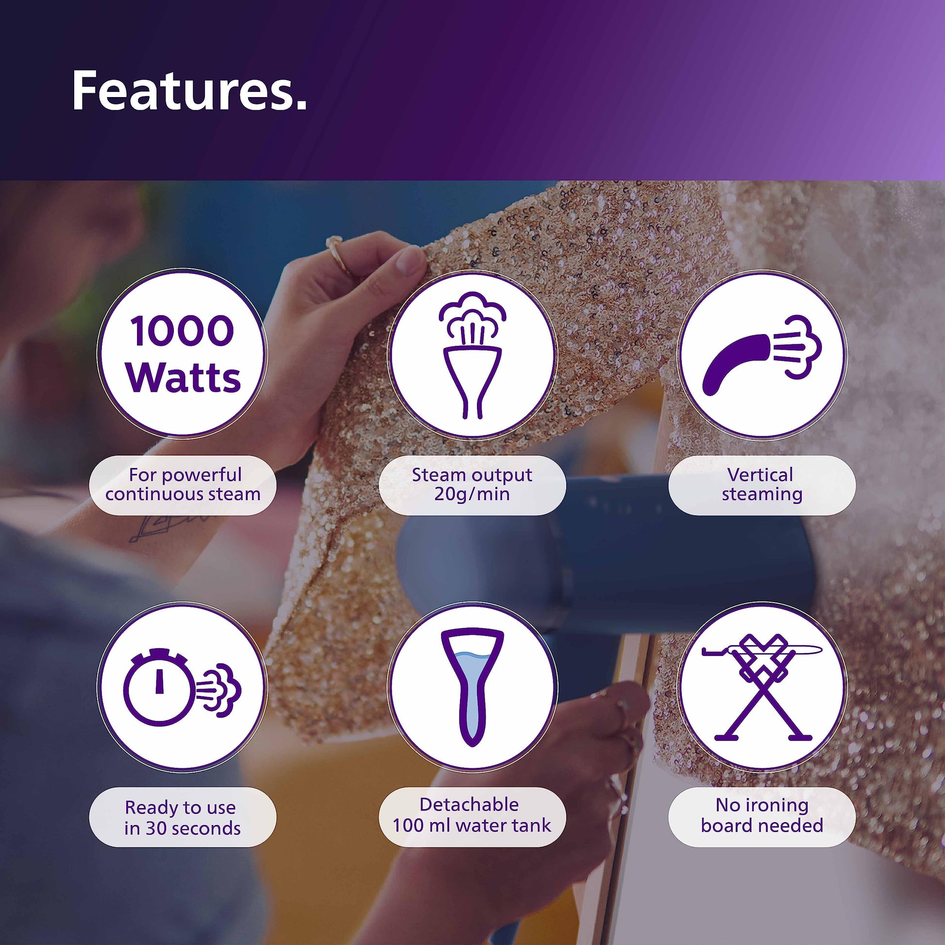 PHILIPS Handheld Garment Steamer STH3000/20 - Compact & Foldable, Convenient Vertical Steaming, 1000 Watt Quick Heat Up, up to 20g/min, Kills 99.9%* Bacteria (Reno Blue), Small