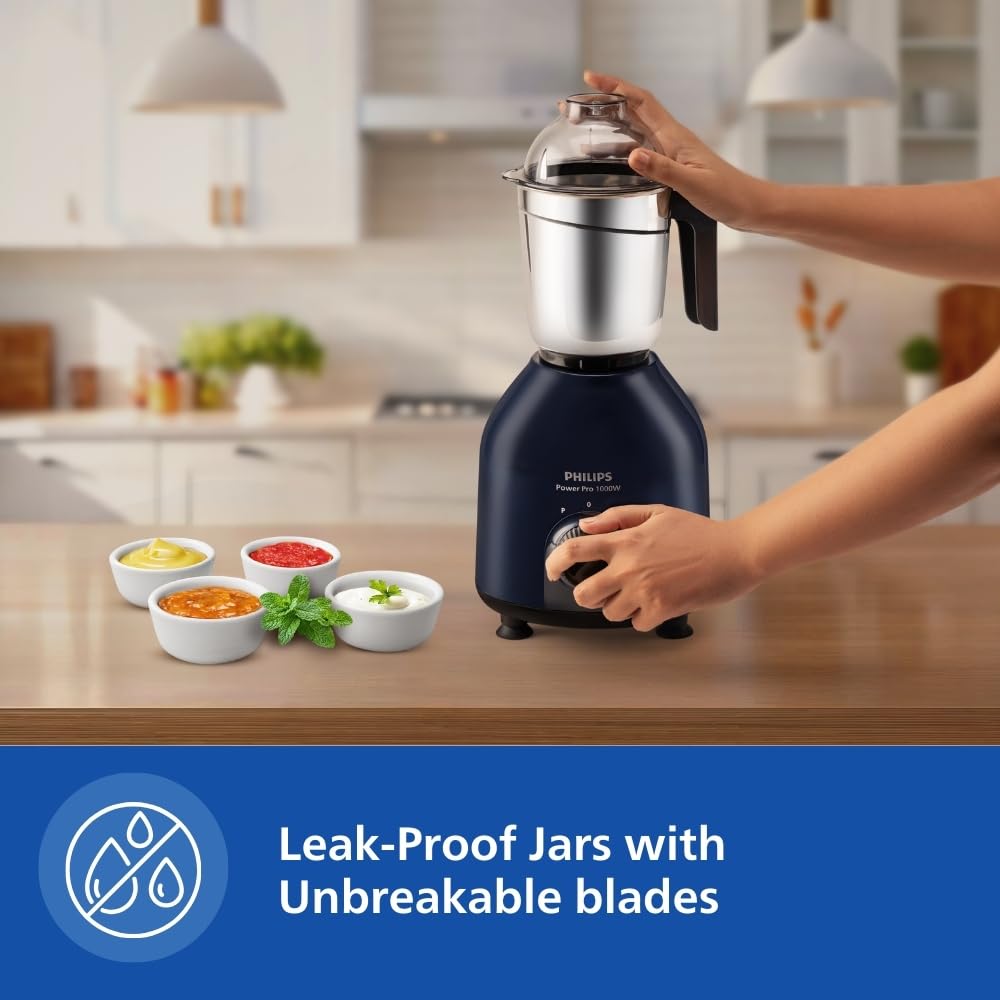 Philips HL7714/01, 1000 W PowerPro Motor Mixer Grinder, 4 Jars (Azure Blue), Edged blade made of superior SS304 material, Quick cool ventilation for longer motor life
