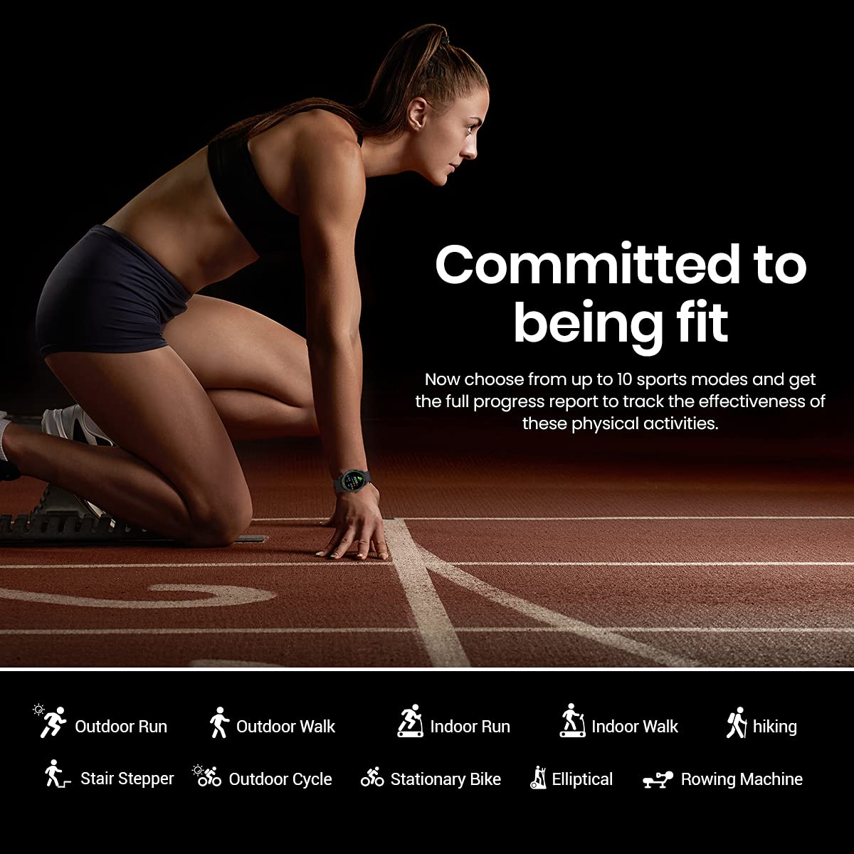 - [10 ACTIVE SPORTS MODES] : Smart activity tracker for calories, steps & distance. It comes with 10 Active Sports Modes: Outdoor Run, Outdoor Walk, Indoor Run, Indoor Walk, Hiking, Stair Stepper, Outdoor Cycle, Stationary Bike, Elliptical and Rowing Machine to keep you on track.