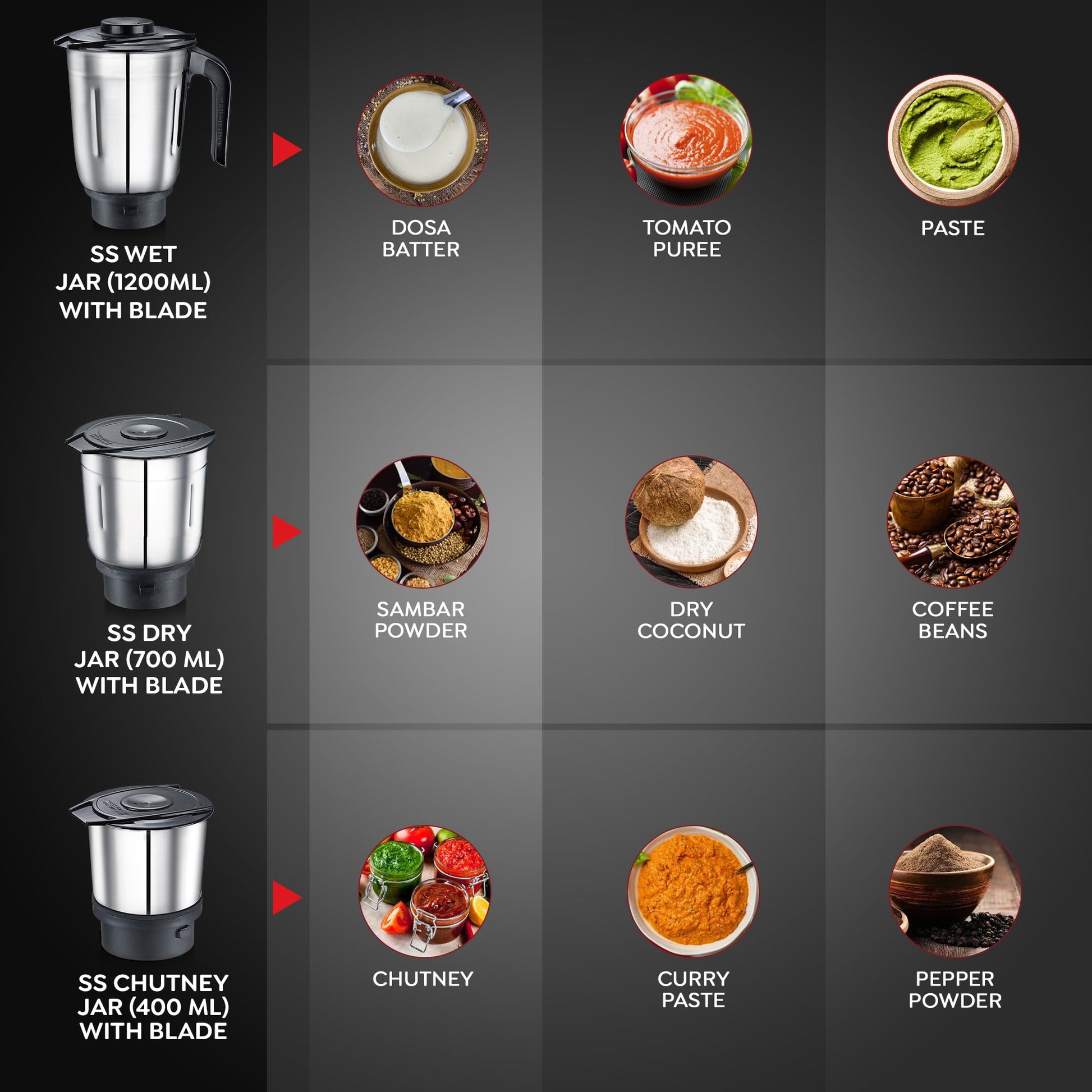 - CAPACITY of JARS: Wet Grinding Jar: 1.2L, Dry Grinding Jar: 700ml and Chutney Jar: 400ml, grinds tough ingredients with ease.
