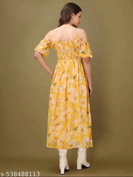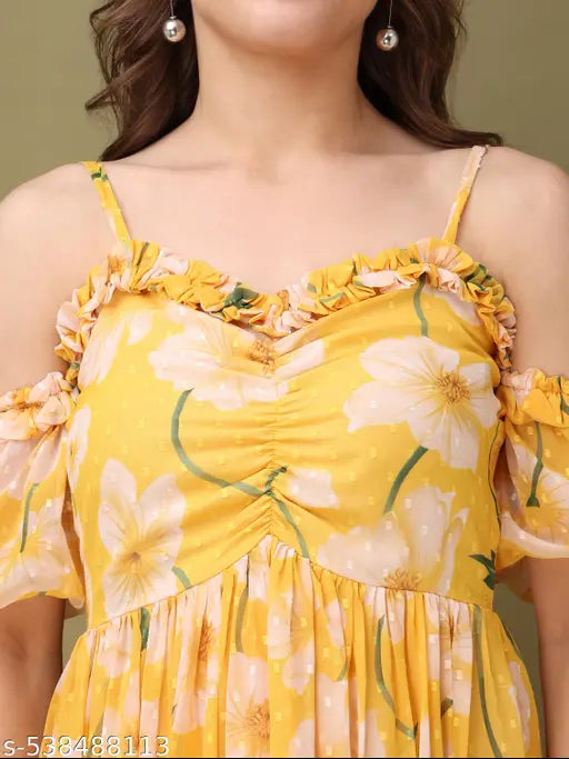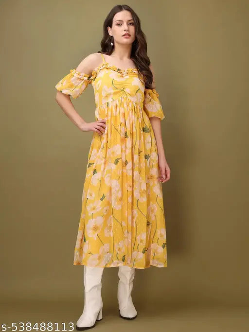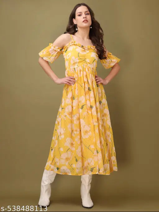This dress from Purvaja grabs attention with its all-over look and design. FabricGeorgette, Print Type Floral Print, Type Maxi Dress, Dress Length Midi (Length-48), Sleeve Short Sleeve, Sleeve Length Puff Sleeve (8-Inch), Neck Sweetheart Neck, Surface style Ruffles, Hemline Flared