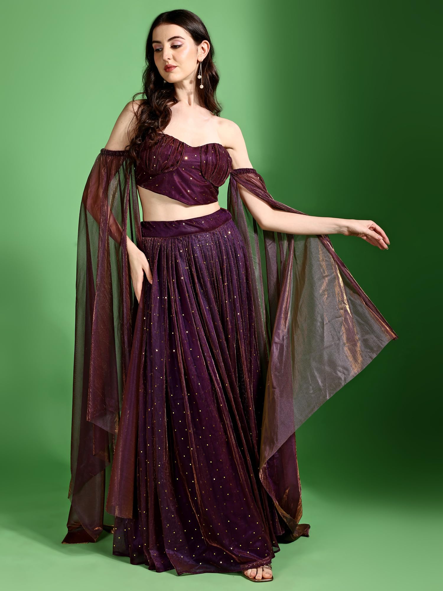 A Western-style lehenga choli with a modern twist is designed in luxurious lycra fabric, known for its stretch and smooth finish. The lehenga features a form-fitting silhouette that flares out at the bottom, giving it a graceful and contemporary appeal. The entire ensemble is embellished with shimmering sequins, adding a touch of glamour and sparkle. The choli (blouse) is tailored in a chic design, with a structured fit that complements the sleek lehenga. Accompanying the outfit is a stylish net dupatta, draped elegantly to enhance the overall look. The dupatta may feature subtle embellishments or a sleek border to maintain the modern aesthetic. The color palette is rich and bold, with deep hues like midnight blue, wine, or charcoal, adding to the dramatic and sophisticated vibe of the ensemble