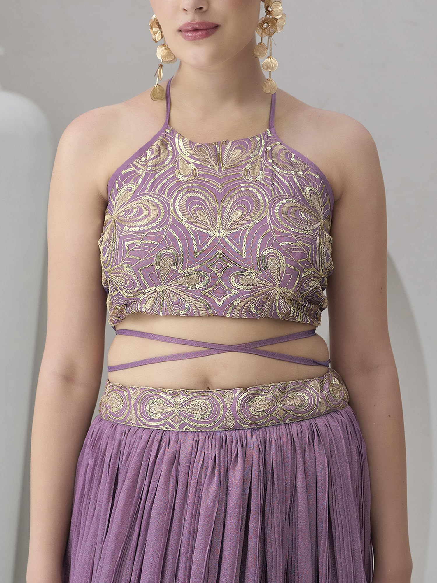 Elevate your festive look with this silk crush lehenga choli, designed with a pleated silhouette that adds graceful volume. The shining fabric is adorned with exquisite sequin and zari embroidery, beautifully highlighted with an embroidered waist belt for a refined touch. The flared hemline enhances the elegance, while the set is completed with a matching dupatta detailed with delicate lace edging, making it a perfect pick for weddings, festive celebrations, and grand occasions.