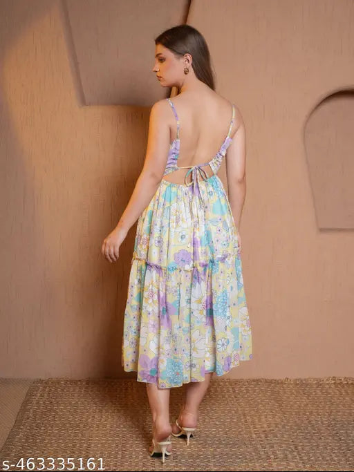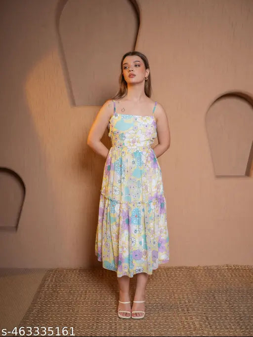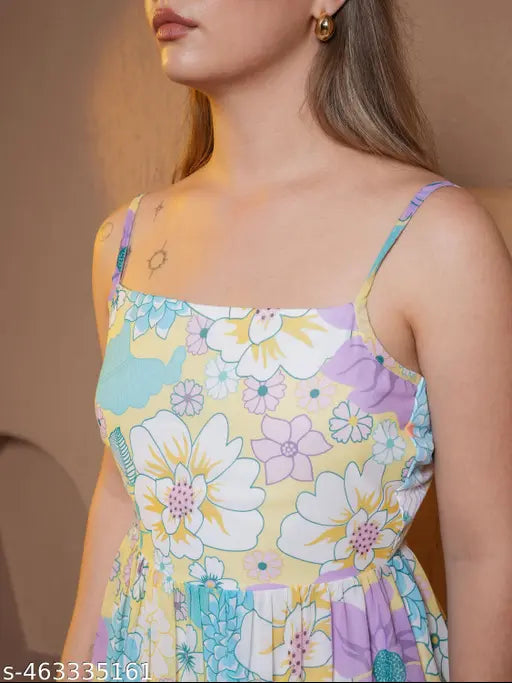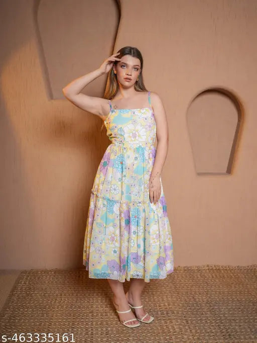 FabricGeorgette Polyester, Type Fit & Flare Dress, Neck Square Neck, Sleeve Sleeve less (Strap sleeve), Dress Length Below knee (45-inches), Product Content 1 Dress, Print Type Floral Print, Hemline Flared, Closer Type Elastic, Surface style RufflesLayersGathers