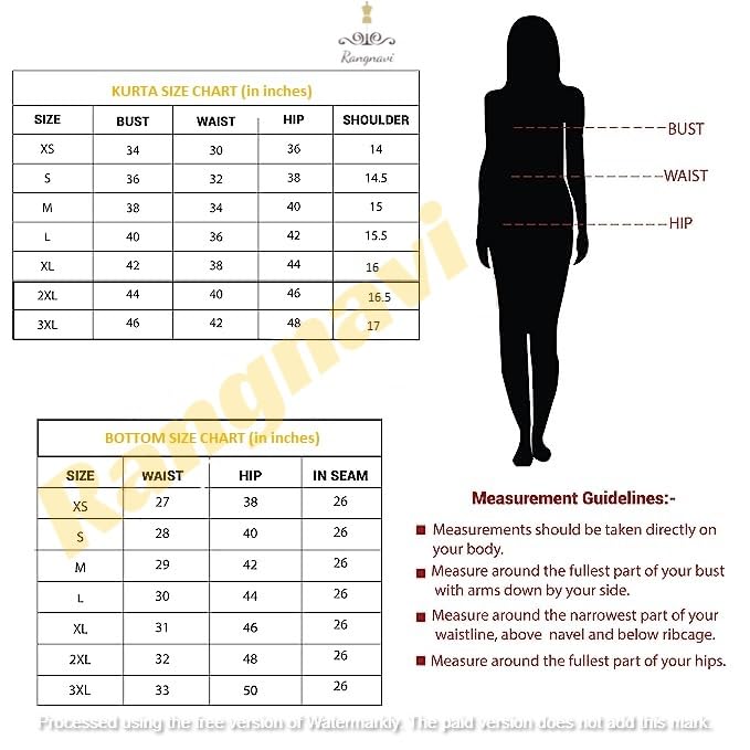 - Size Chart- Kurta- XS- 34 in , S-36 in , M-38 in , L-40 in , XL-42 in , XXL-44 in. For More Please refer to the size Chart below..