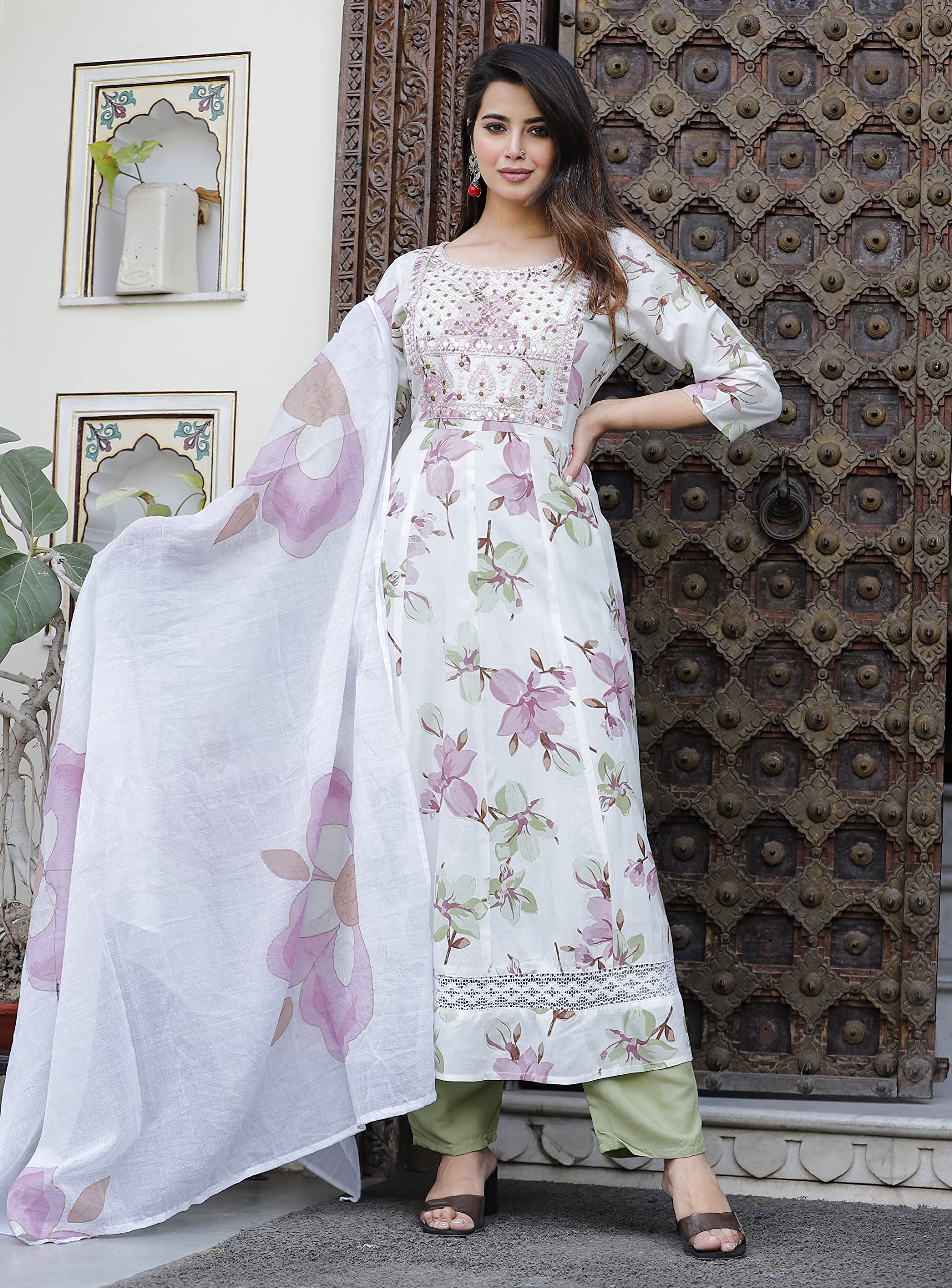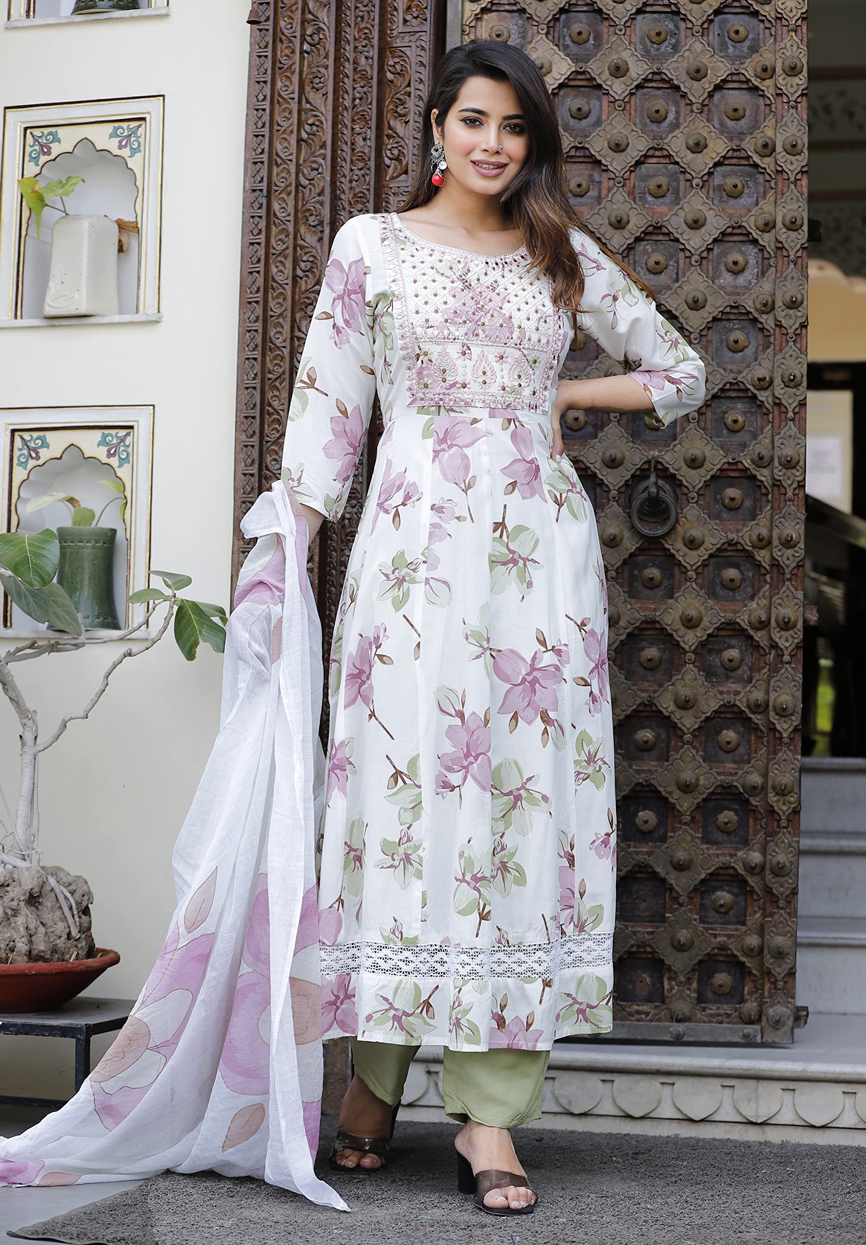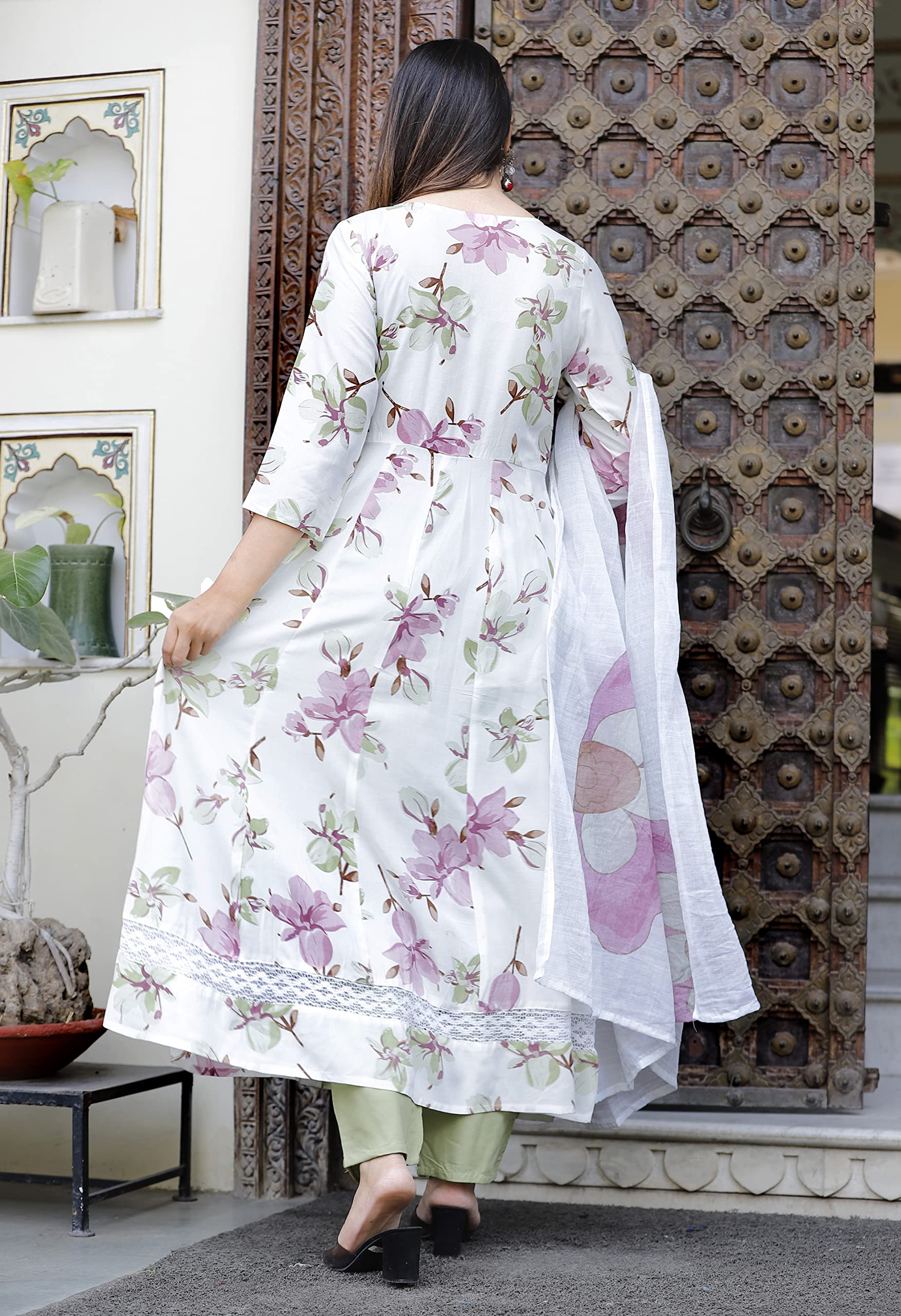 Rangnavi Women Rayon Anarkali Embroidered Printed Kurta Pant and Dupatta Set