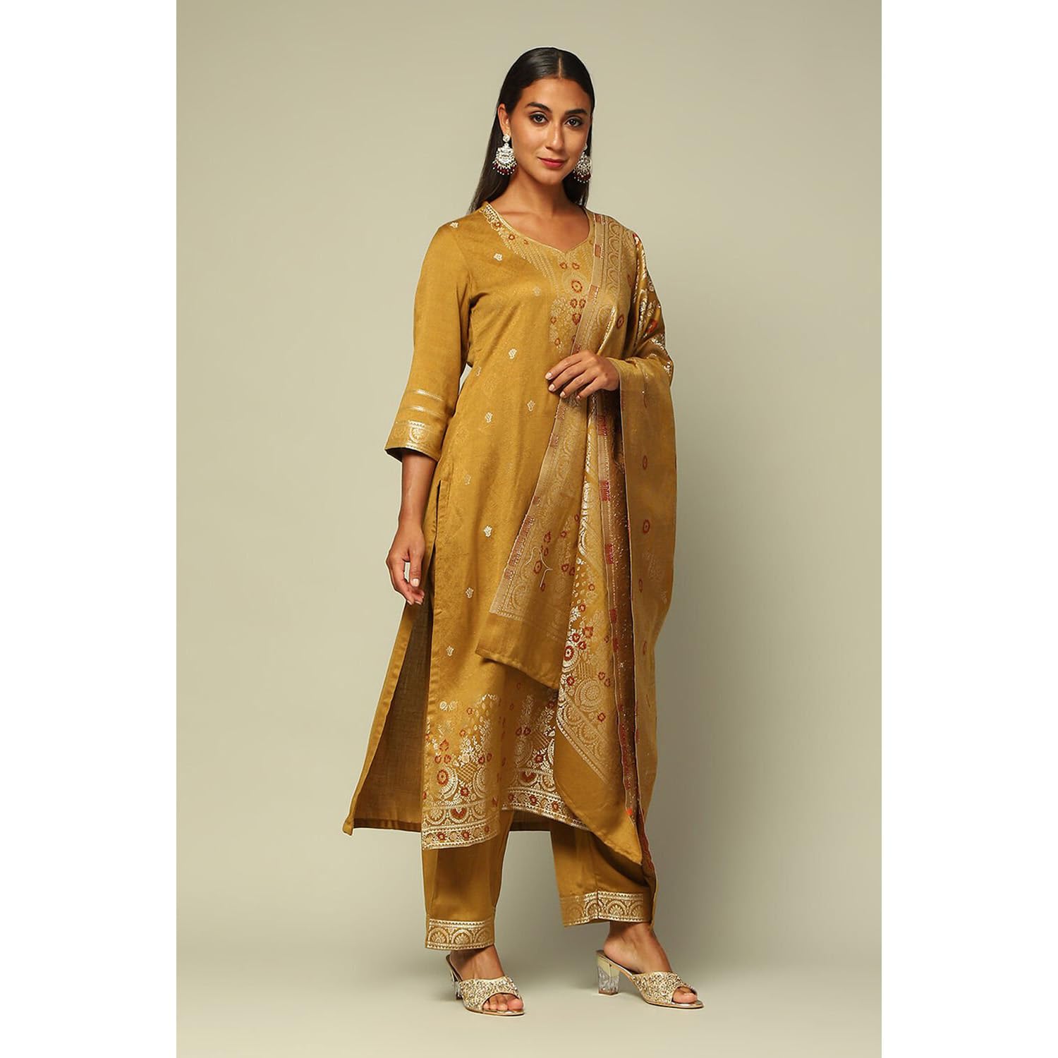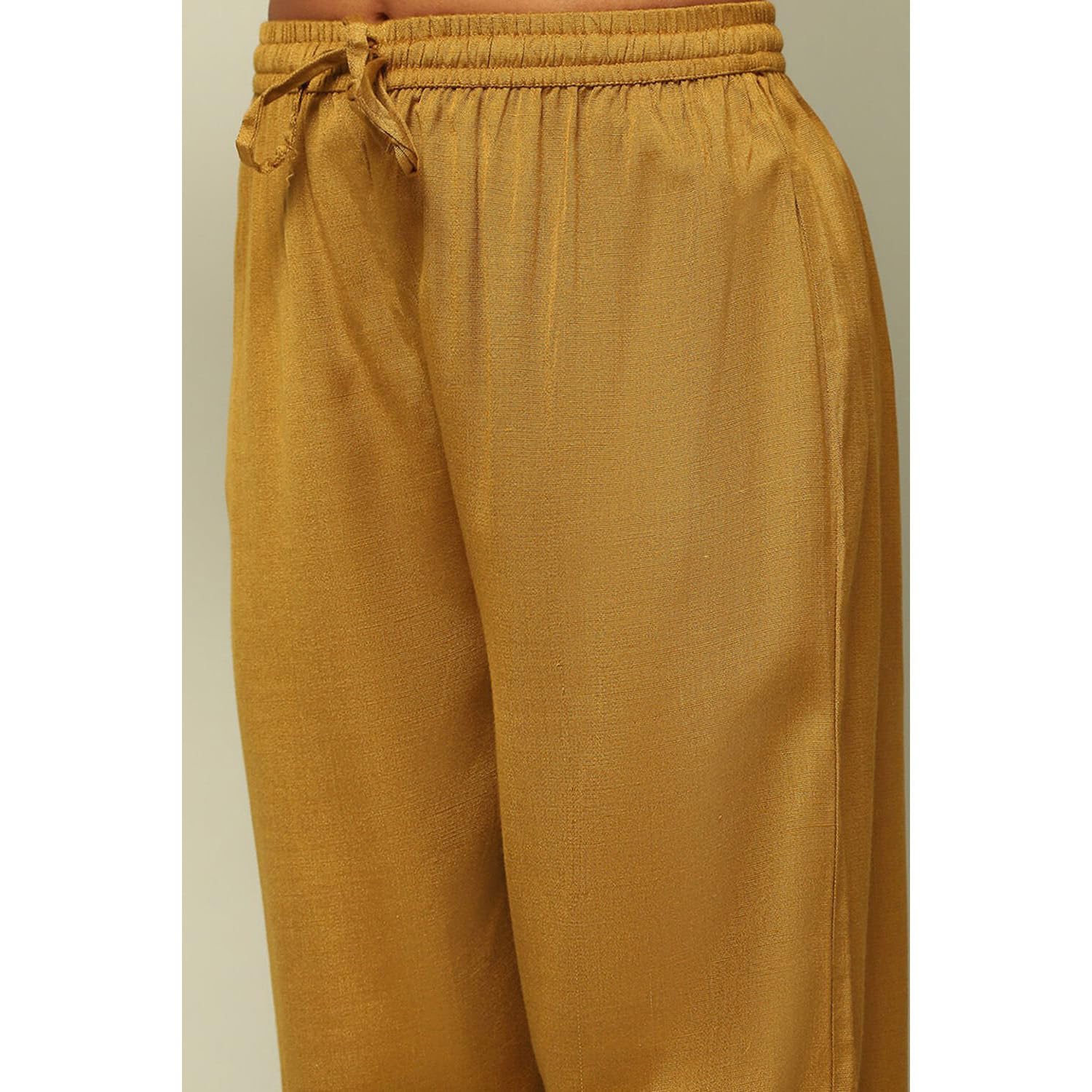 Rangriti Women Mustard Acrylic Straight Yarn Dyed Kurta Palazzo Suit Set