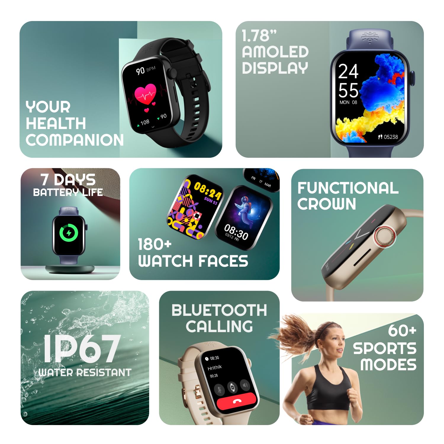 - 1.78" AMOLED Display | 368*448 pixels | 550 nits peak brightness Advanced Bluetooth Calling I Functional Crown