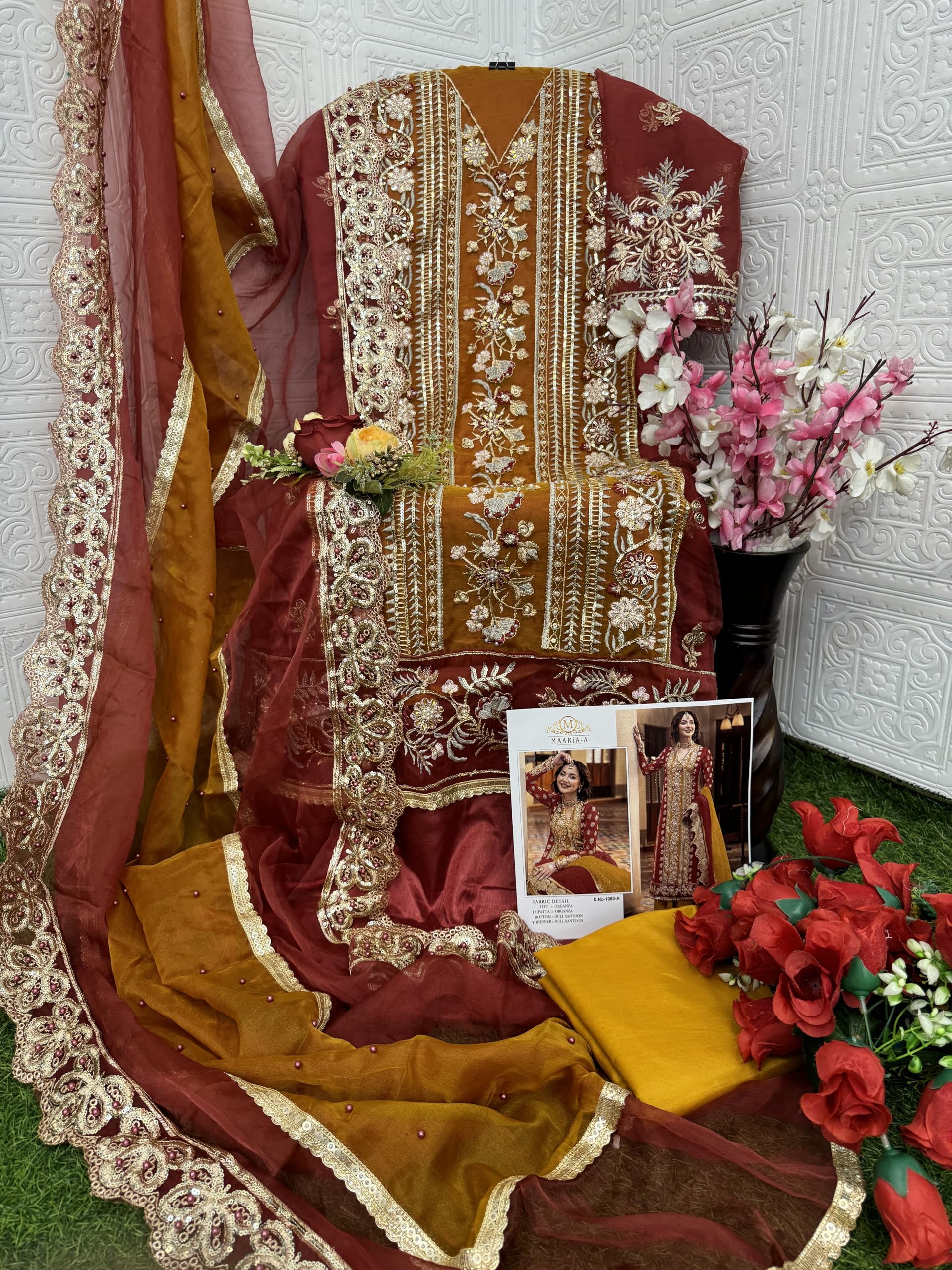 RUDRAPRAYAG Women's Mustard Color Traditional Organza Embroidered Semi Stitched Anarkali Suit Set With Embroidered Dupatta