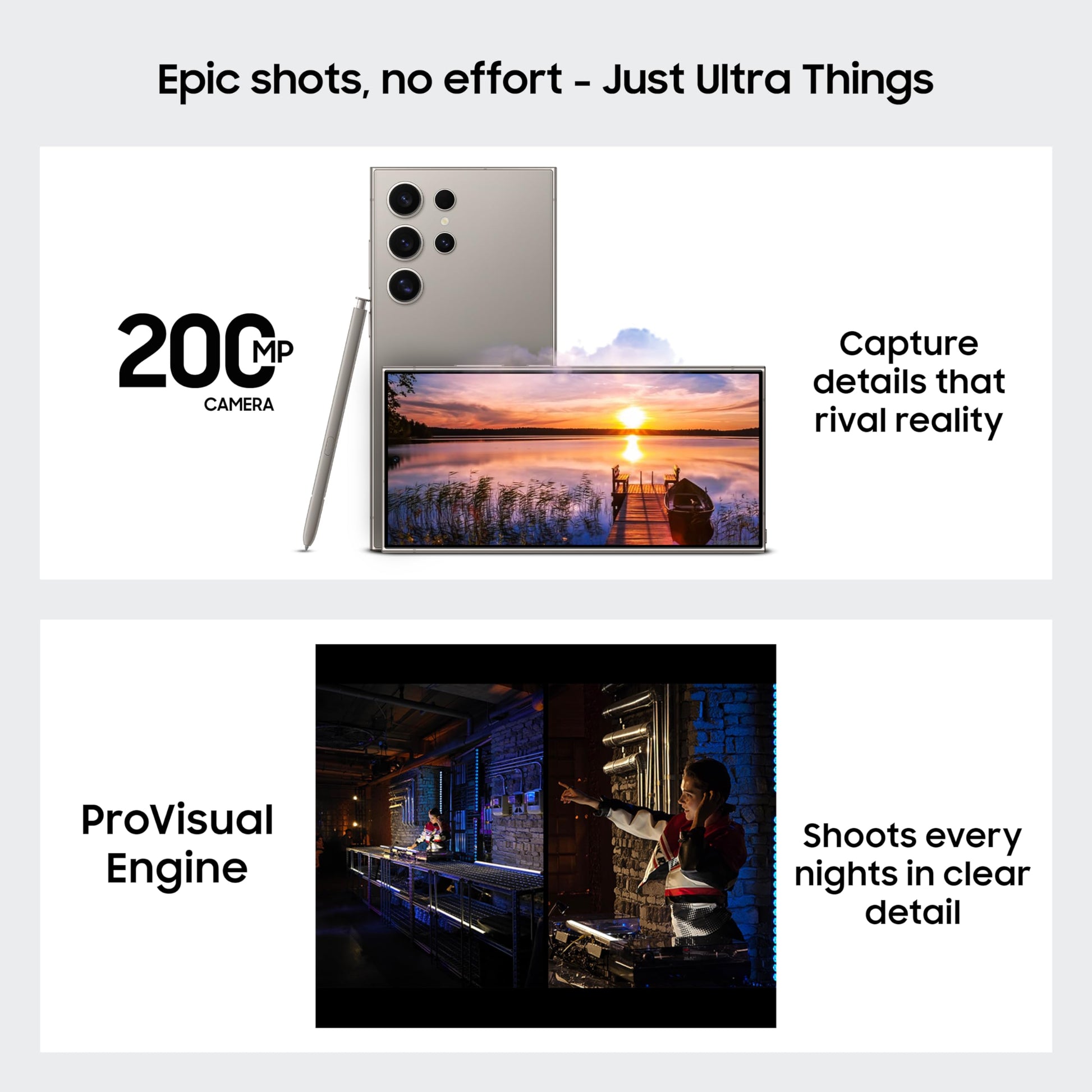 - EPIC SHOTS, NO EFFORT - With the most megapixels on a smartphone and AI processing, Galaxy S24 Ultra sets the industry standard for image quality every time you hit the shutter. What's more, the new ProVisual engine recognizes objects — improving colour tone, reducing noise and bringing out detail.