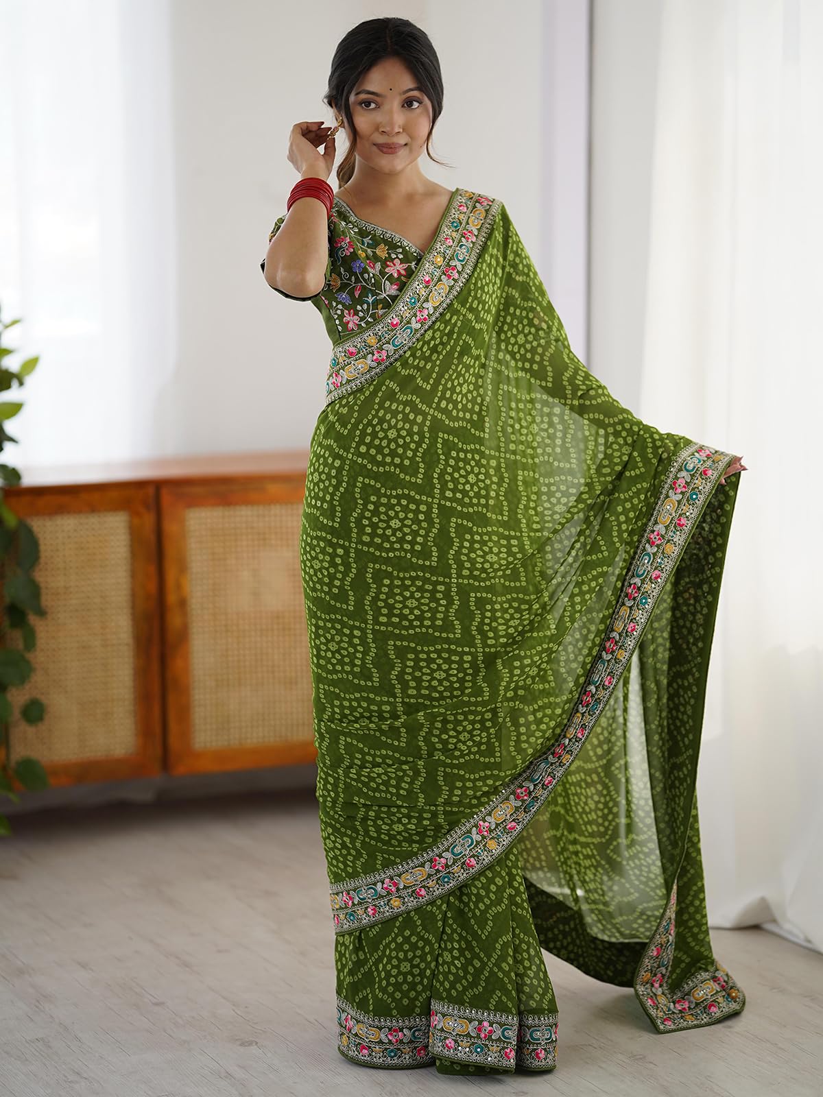 Satrani Women's Georgette Bandhani Printed Festive Saree with Unstitched Blouse Piece (4486S554N_Mehandi Green)