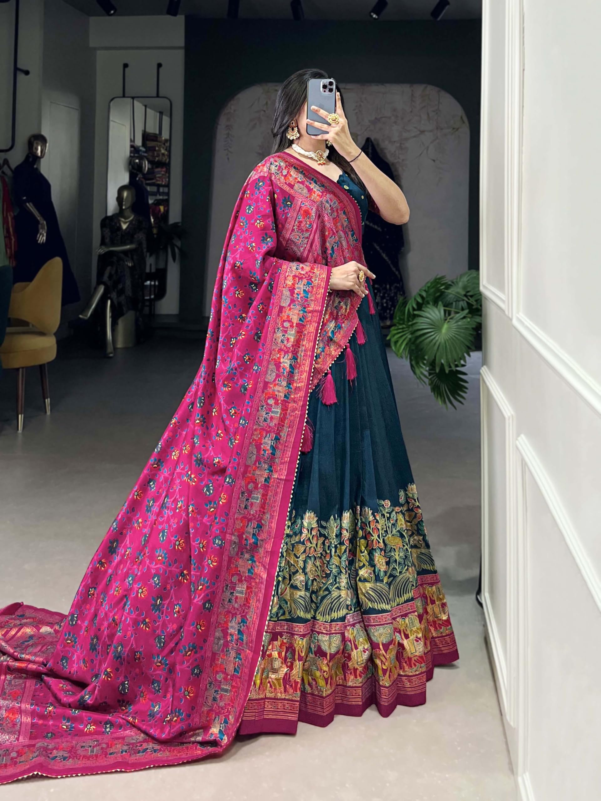 - Lehenga Work : ikkat patola Print With Foil Work Border ,Blouse Work : Printed With Foil Work Border ,Dupatta Work : ikkat patola Print With Gotta Patti Lace Border Also Comes With Tassels