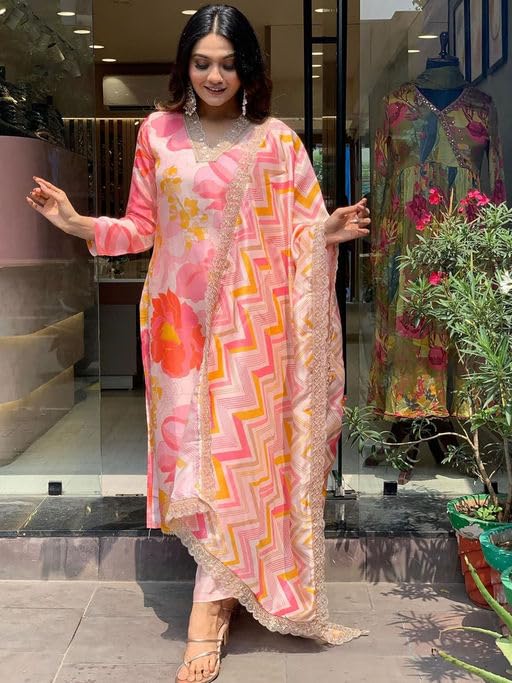SHIENZY Women's Casual Cotton Blend Floral Printed V Neck Straight Traditional Suit Salwar with Dupatta || Matching Kurta Pant Sets || Festive Ethnicwear (1501SHZ_PNK_XL) Red