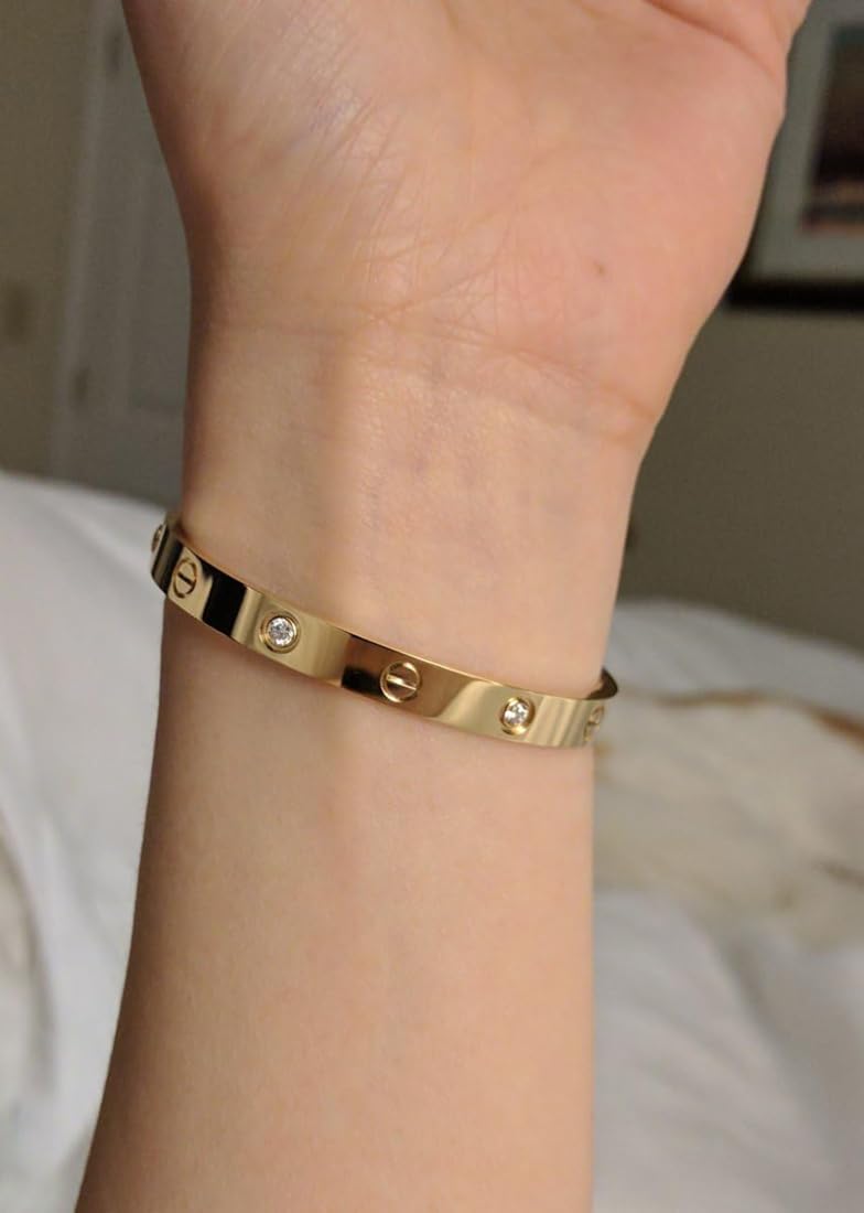 - Premium Quality - Handcrafted with 100% Stainless steel for long lasting, high quality cubic zircon has been perfectly set on the love bangle. 18K real gold plating will ensure a very long lasting brilliant finish that is nickel free, lead free and friendly to sensitive skin. Great choice for anniversary, engagement, party, meeting, dating, wedding, daily wear, etc