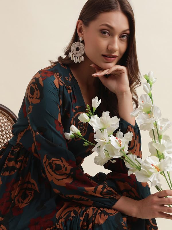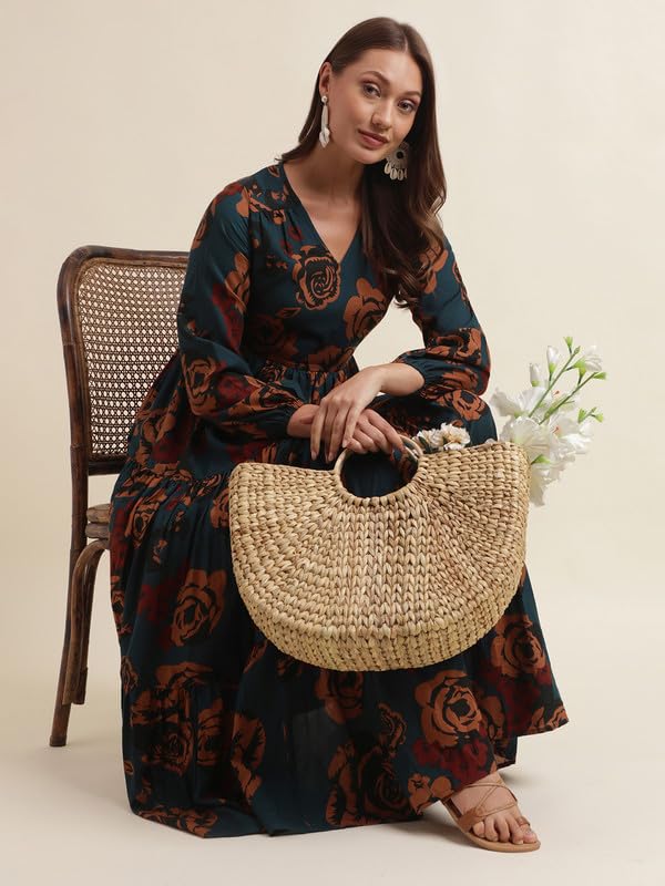 SIRIL Women's Western Poly Rayon Dresses | Maxi Dress | Printed Western Dress for Women (493TK7614-M_Blue)