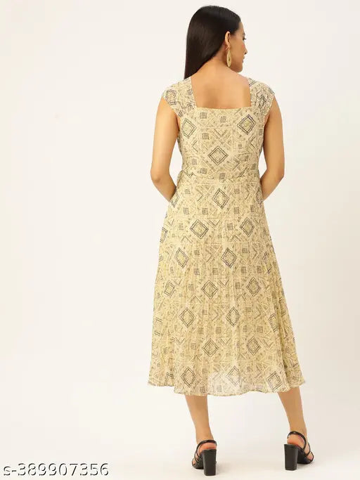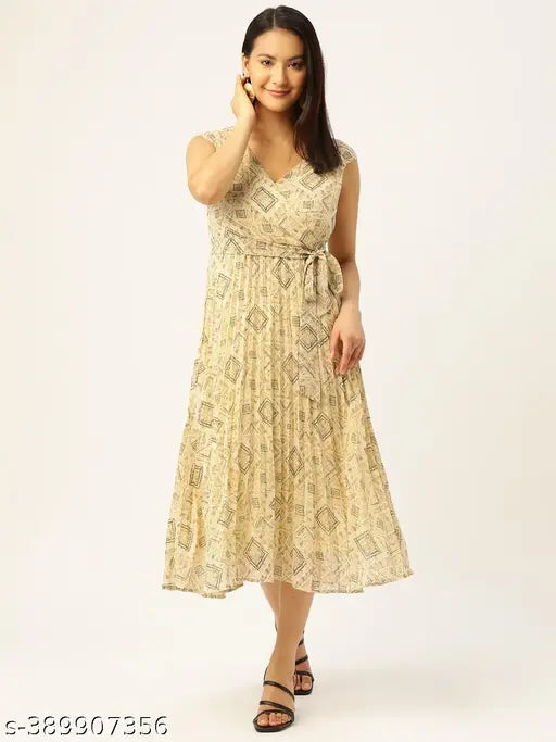 Yellow and black geometric print wrap dress , V-neck , Sleeveless , Gathered or pleated detail , Midi length in flared hem , Georgette fabric