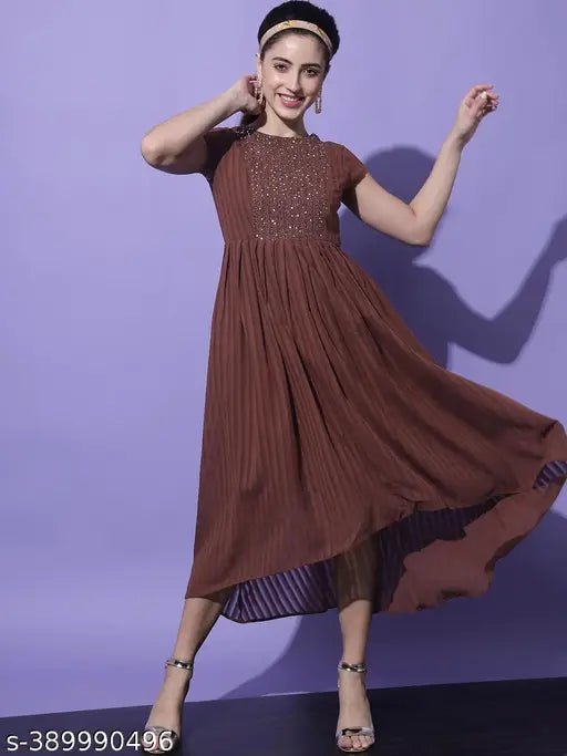 The embroidered sequinned georgette A-line midi dress is a stunning and glamorous piece made of lightweight georgette fabric with intricate embroidery and sparkling sequins. It features a classic round neckline, sheer long sleeves, and an A-line silhouette that flatters the figure. The dress is perfect for special occasions and pairs well with strappy heels and statement jewelry.