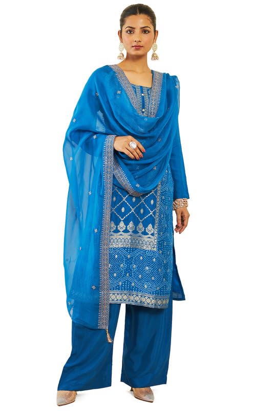 Soch Womens Blue Silk Unstitched Dress Material With Zari Woven Floral Designs And Embroidery