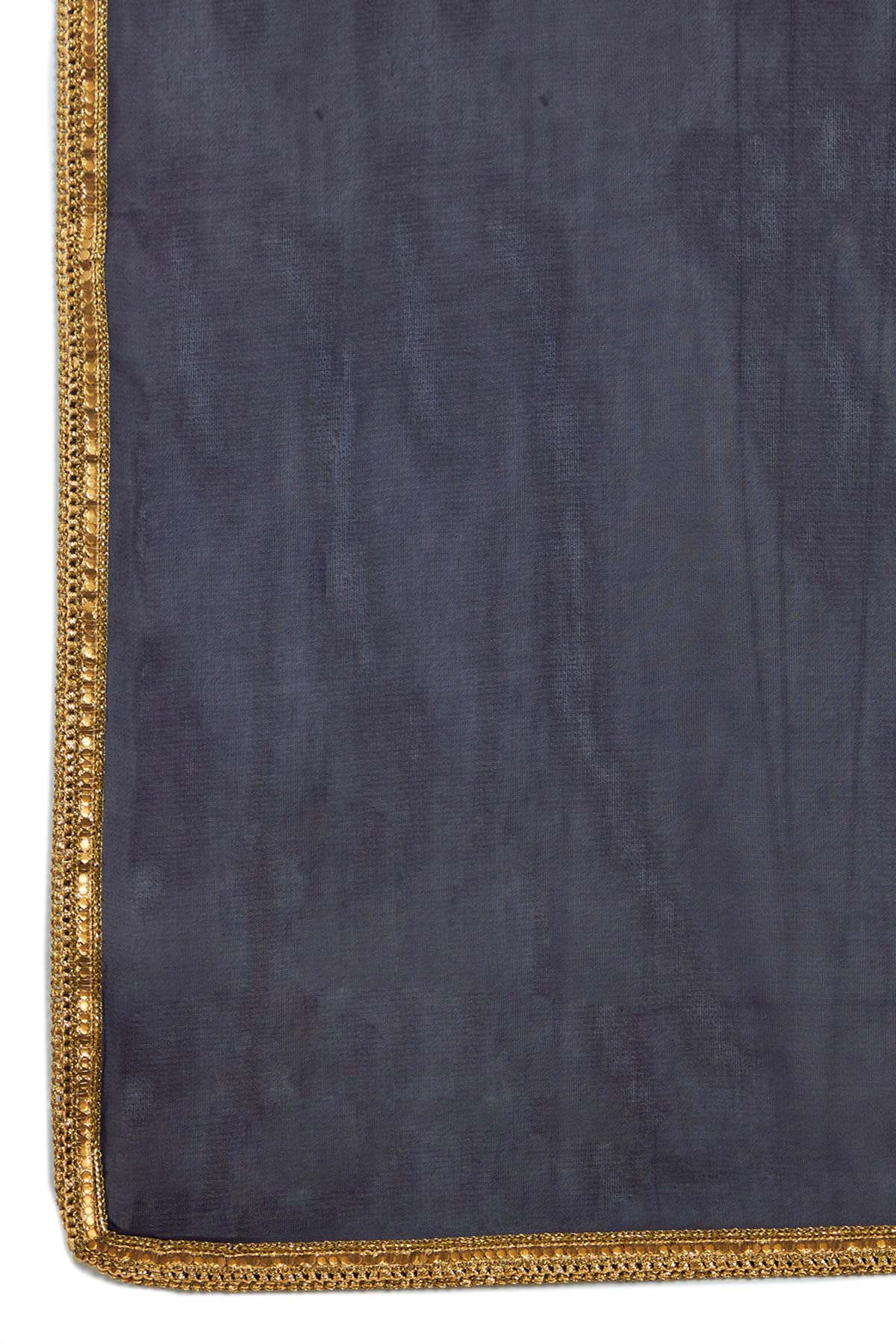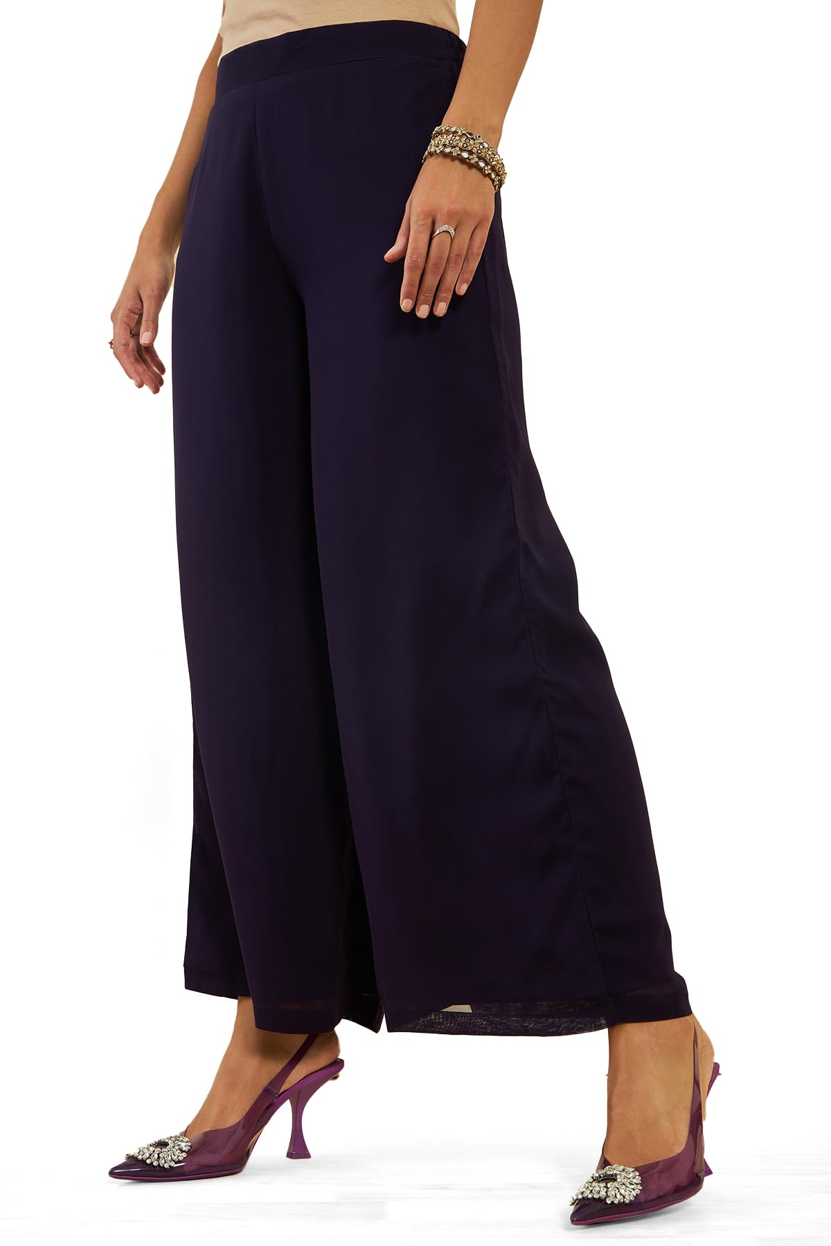 Luxurious, elegant, and stylish – these words perfectly illustrate our wine georgette suit set. The kurta has a round neckline with three quarter sleeves, high side slits and gathered waist. It is detailed with embroidery and sequins all over. It accompanies a solid palazzo and dupatta with zari borders for a complete look. Add a dash of glam to your ethnic wear collection with this stunning suit set!