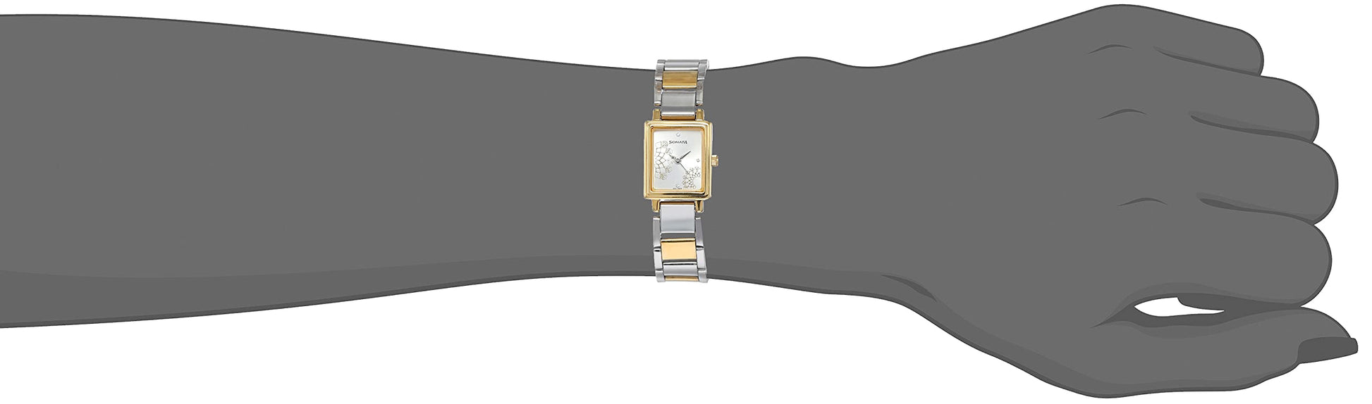 Symbolising Classiness and Elegance Trendy women find the Sonata wedding 8080BM01 watches very fascinating as they can be carried with panache to any formal occasion. The silver-coloured rectangular dial embossed with floral patterns gives these Sonata women's watches a special feminine appeal. Moreover, the golden bezel and the dual-tone hue of the strap seamlessly contrast with the dial of Sonata wedding watches accentuating its overall look. Its entire body is made of solid stainless steel lending the timepiece extraordinary sturdiness making it ideal to use for years on end. This women's wristwatch remains waterproof up to a maximum depth of 30 m, which means you can wash dishware under running water wearing the watch.Blending Aesthete with Functionality These Silver Dial women's watches from Titan having dimensions of 19 x 22 x 7 mm and weighing under 500 g are very comfortable to put on. The band of these women's watches has been designed like a bracelet with interlocking chain links. So the chronometer looks like a sophisticated piece of jewellery when you put it around your wrist. Its deployment clasp-type buckle helps the same to remain securely fastened to your wrist making you feel uncomfortable. You can present this Sonata women's water-resistant watch as an exclusive gift item to a close friend or a family member of yours during his or her wedding anniversary or birthday. Brand: Sonata Collection: Wedding Gender: Women Display: Analogue Case: Stainless Steel Dial Shape: Rectangular Dial Colour: Silver Dial Dimension: 19 x 22 x 7 mm Hands: 3 Hand Movement Markers: Stone Studded in Four Hour Markers Strap Type: Stainless Steel Strap Colour: Silver, Gold Movement: Quartz Water Resistance: 30 m