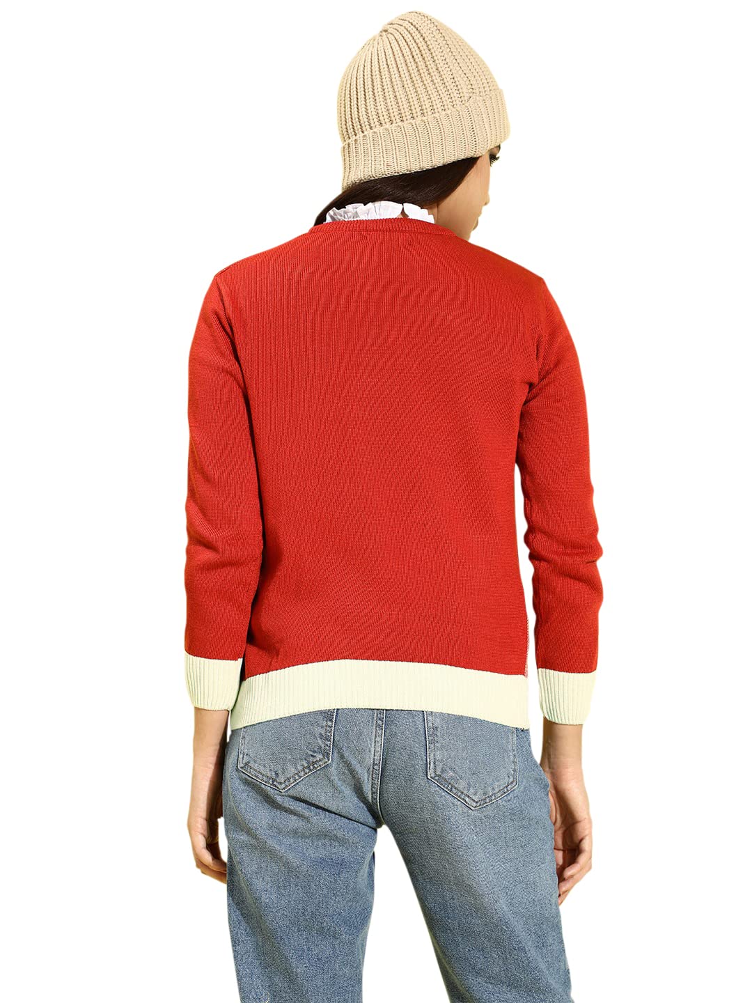 Red self design Christmas themed sweater ,has a round neck, long sleeves, ribbed hem