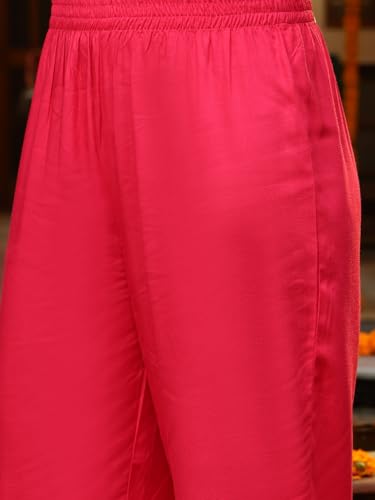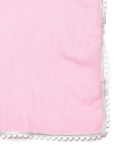 - Pink floral printed rayon straight kurta pant dupatta set. kurta has mirror lace on v-neck, 3/4 sleeves and solid pant with solid organza dupatta