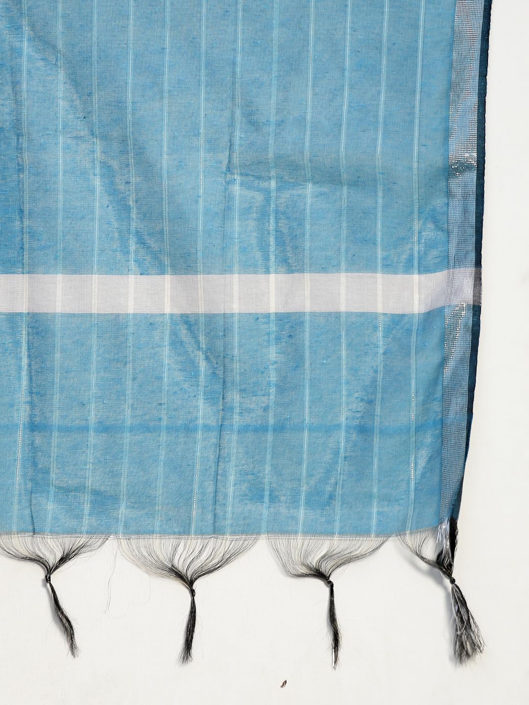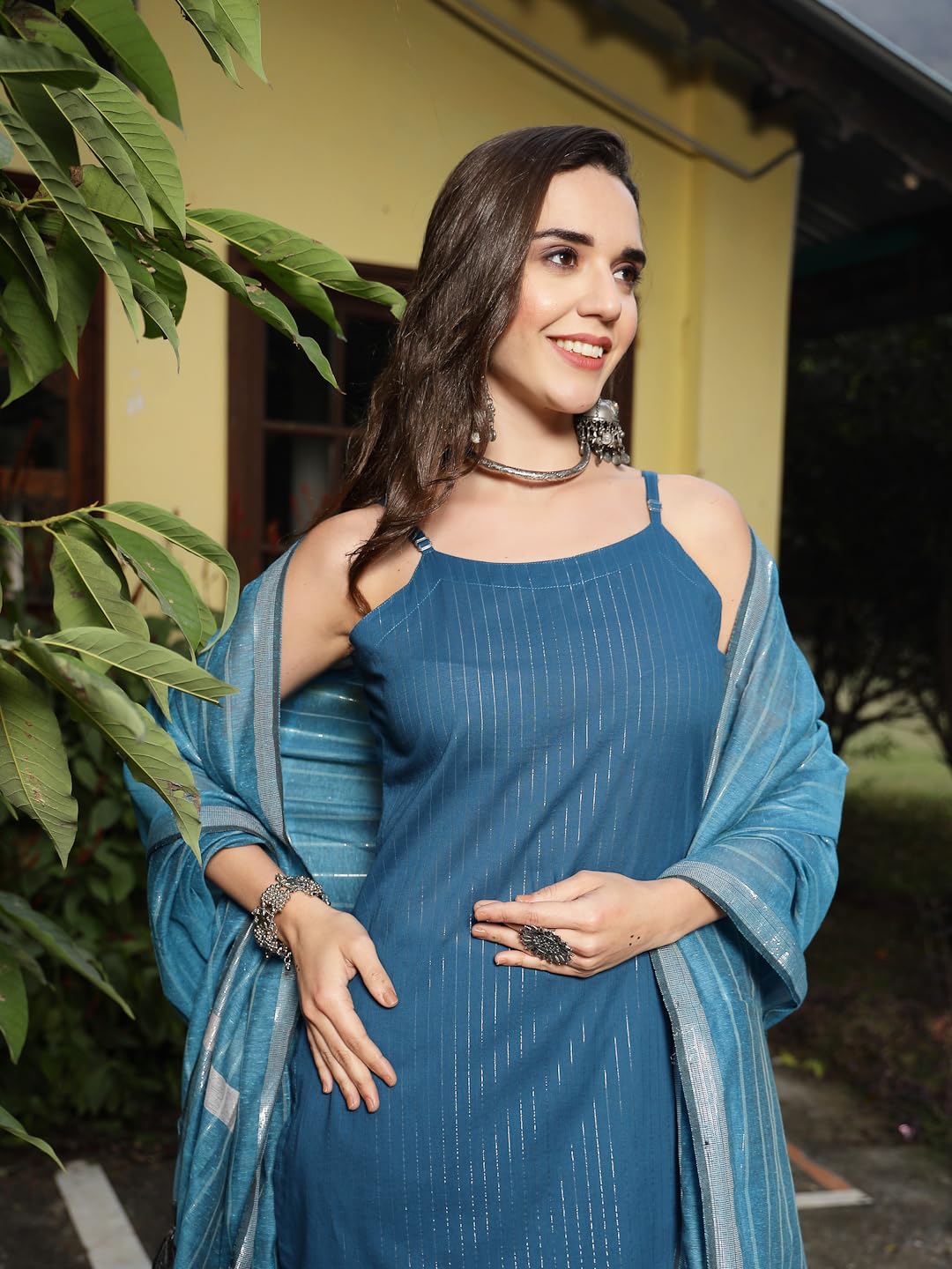 - Teal blue woven design lurex cotton blend straight kurta pant dupatta set. Kurta has strappy sleeves and cotton blend pant with cotton blend dupatta