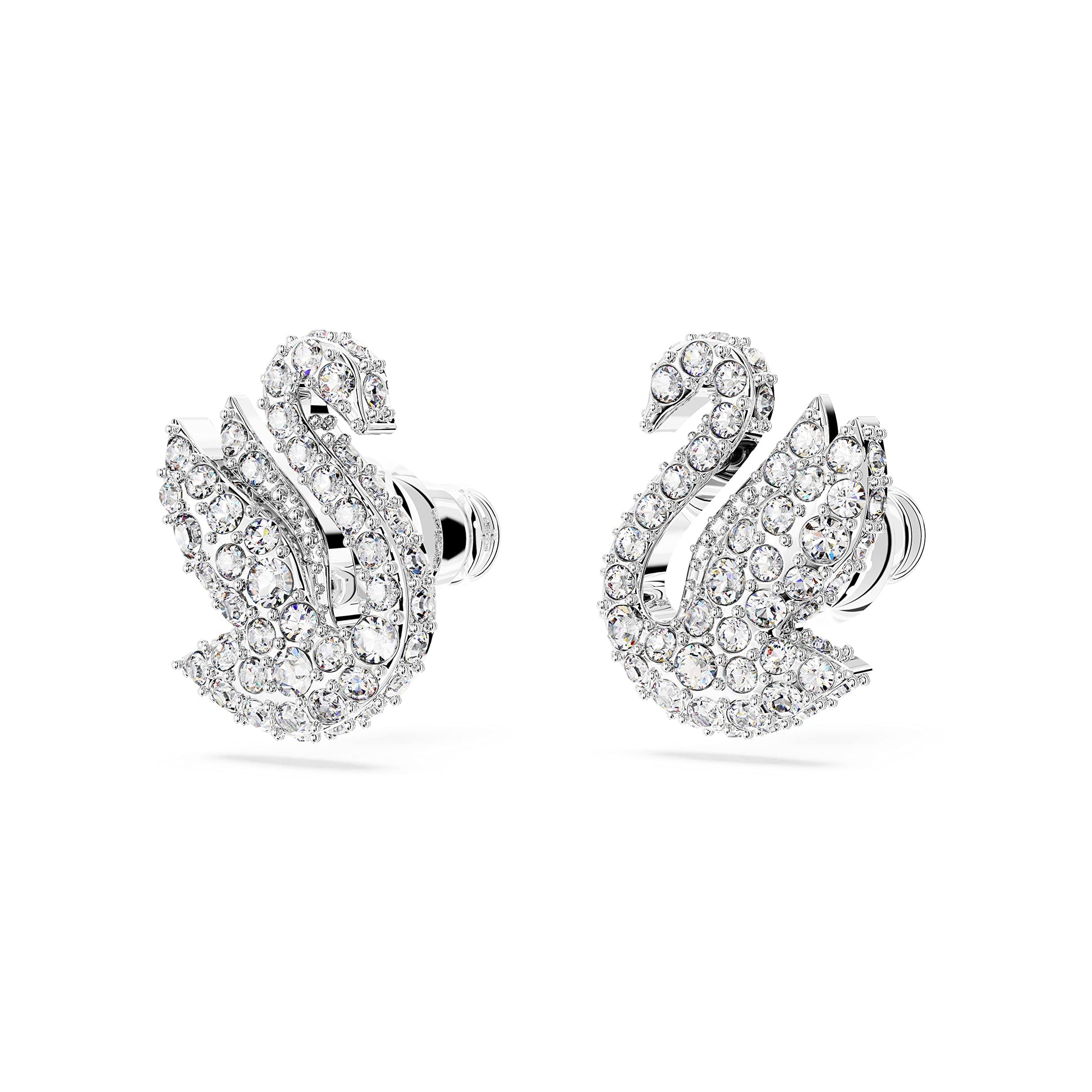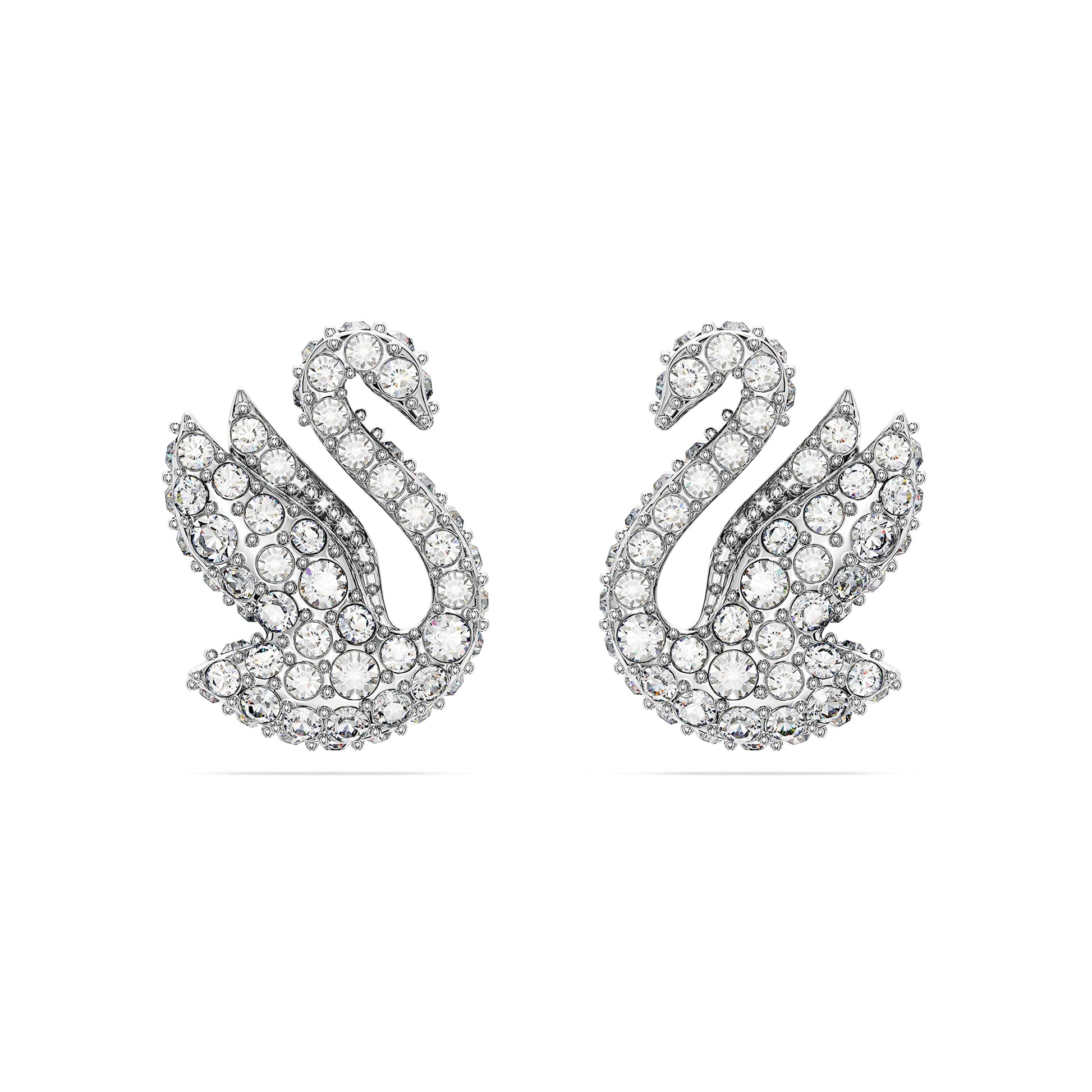 - Items delivered: (1) Pair of SwarovskiIconic Swan stud earrings, Swan, White, Rhodium plated finished setting, complete with Swarovski earring box