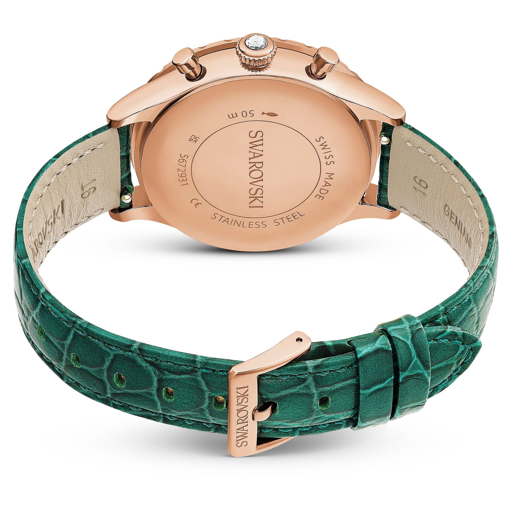- Eminently elegant: This green chronograph watch delivers a perfect fusion of watchmaking expertise and Swarovski savoir-faire. The round 37mm case is made with a rose gold-tone finish and features a crystallized bezel, which is neatly faceted and accompanied by a circle of clear pavé.