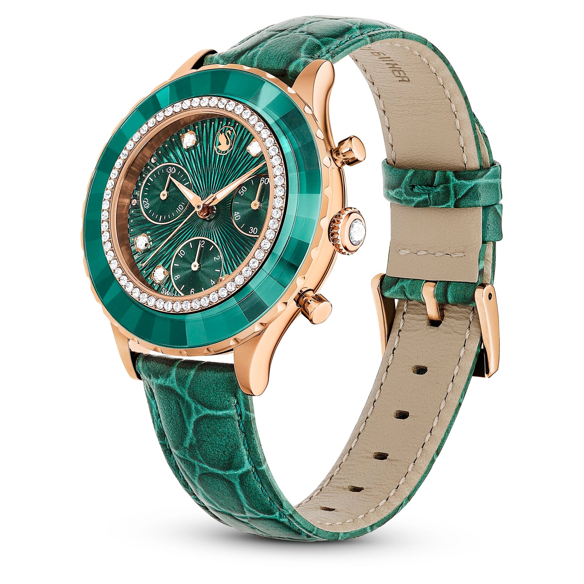 - One swarovski Octea Chrono watch, Swiss Made, Leather strap, Green, Rose gold-tone finish, with swarovski watch box