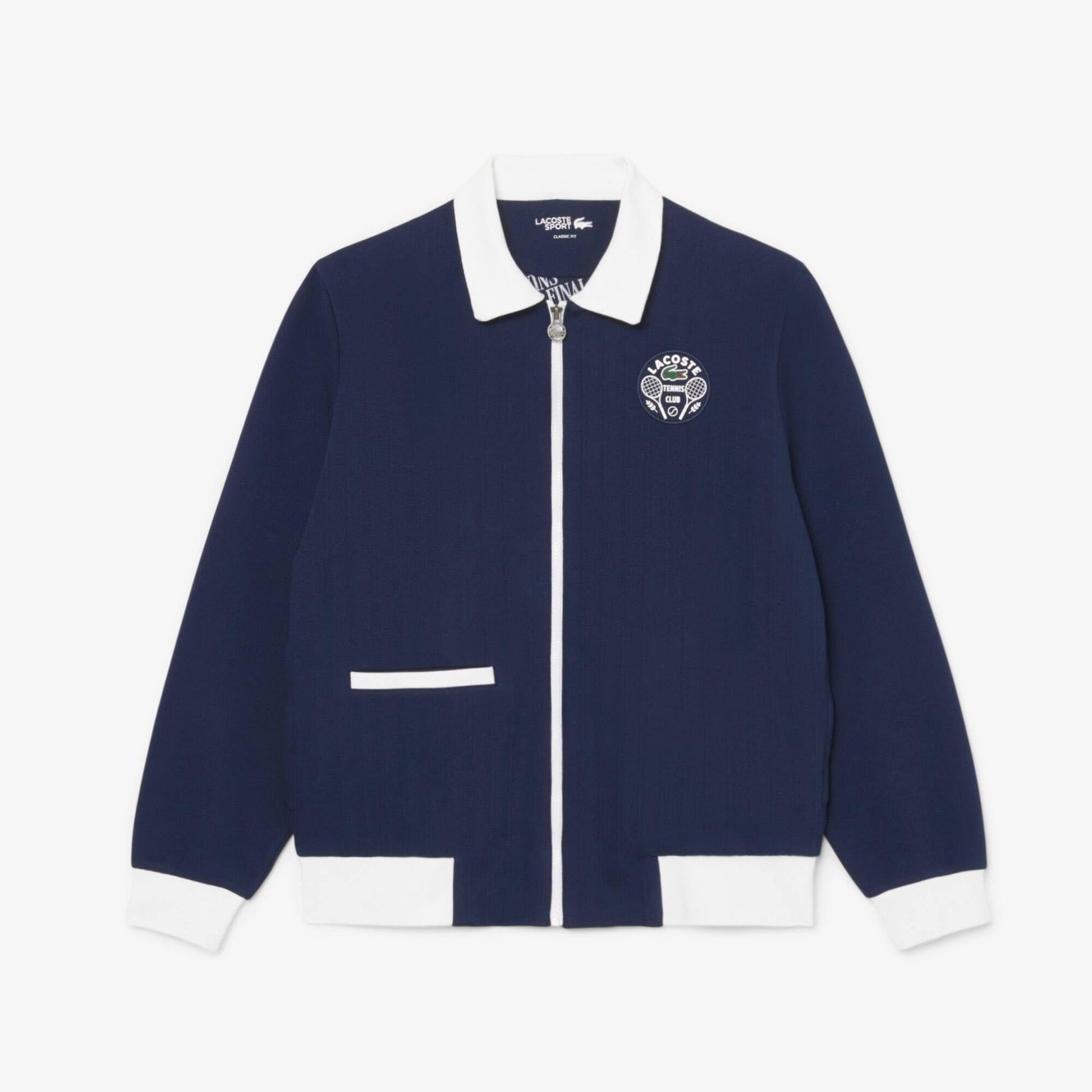 - This tennis jacket is the fruit of 90 years of Lacoste fashion and sportswear expertise. Made from stretch fleece with Ultra Dry technology to leave you free to move and keep you feeling fresh, plus sophisticated details, including ribbed accents, a heritage badge and a graphic print lining, for an elegant retro feel.