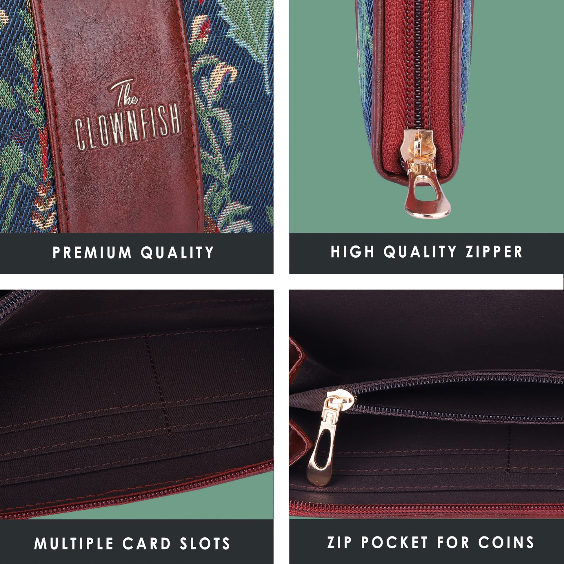 The Clownfish Aria Collection Tapestry Fabric & Faux Leather Zip Around Style Womens Wallet Clutch Ladies Purse with Card Holders (Navy Blue- Floral)