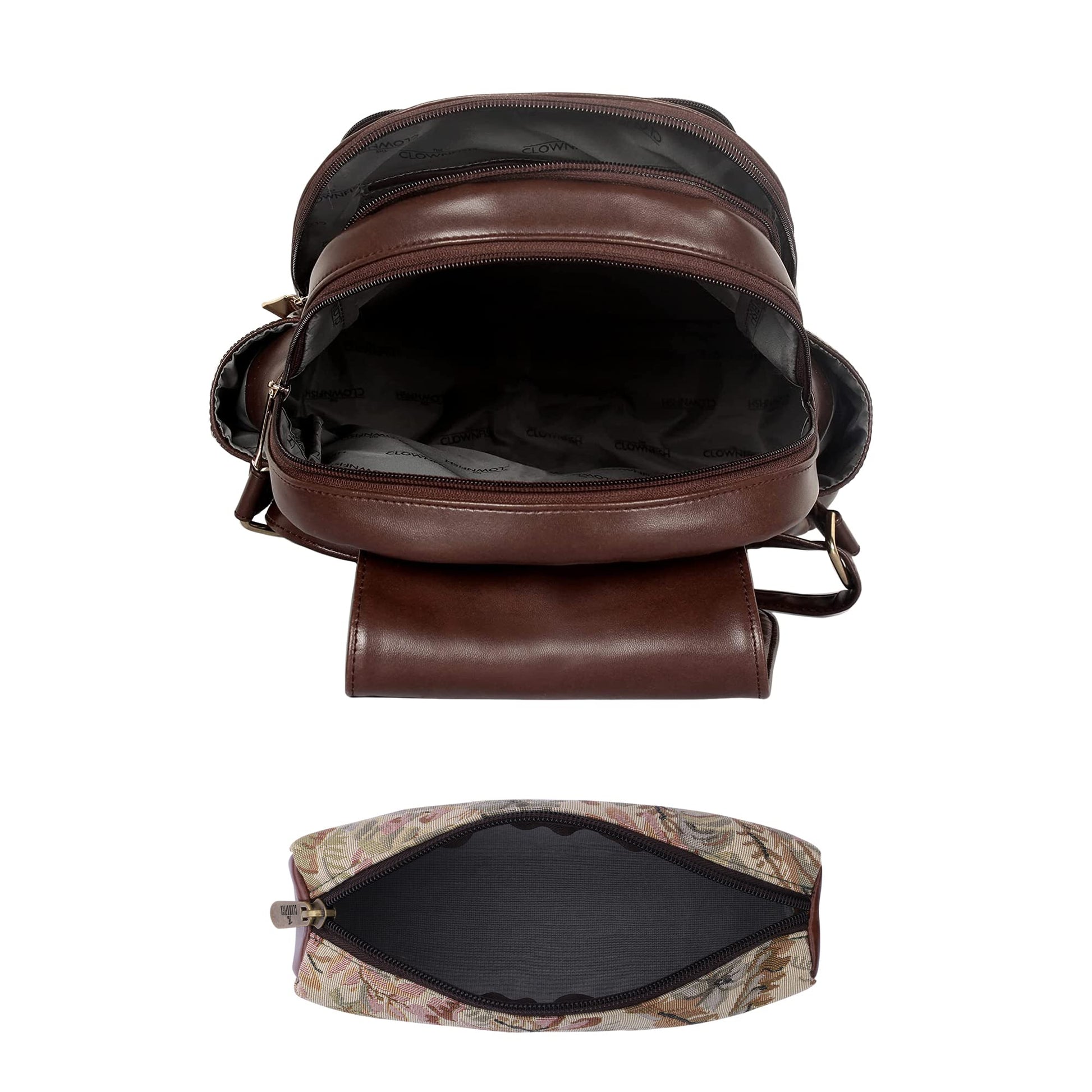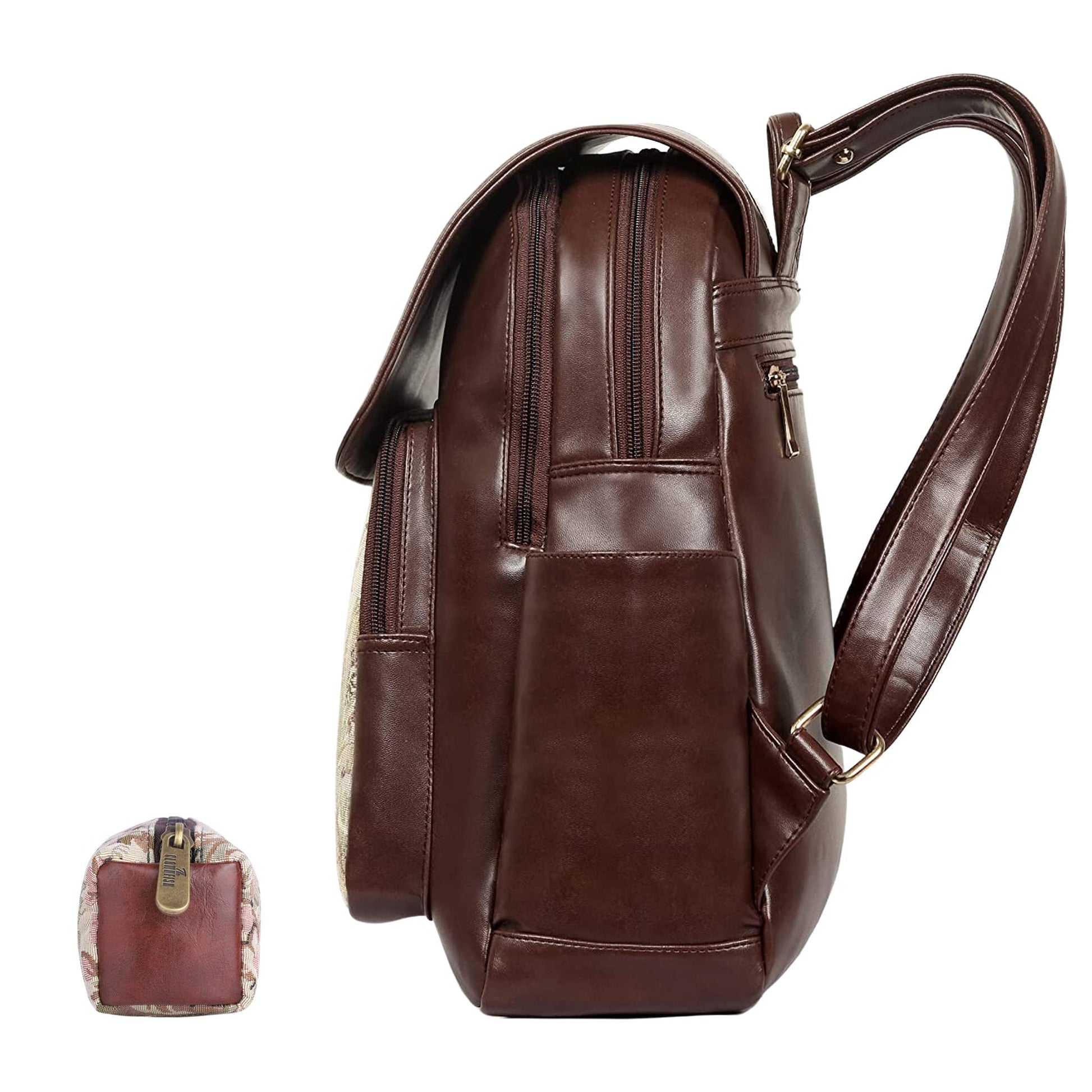 - PREMIUM MATERIAL: This combo of womens backpack & pencil pouch is made from combination of Faux leather & Tapestry fabric. For the inner lining soft feel polyester fabric is used. Comes with durable reinforced stitching and fittings like zippers, pullers, snap buttons.