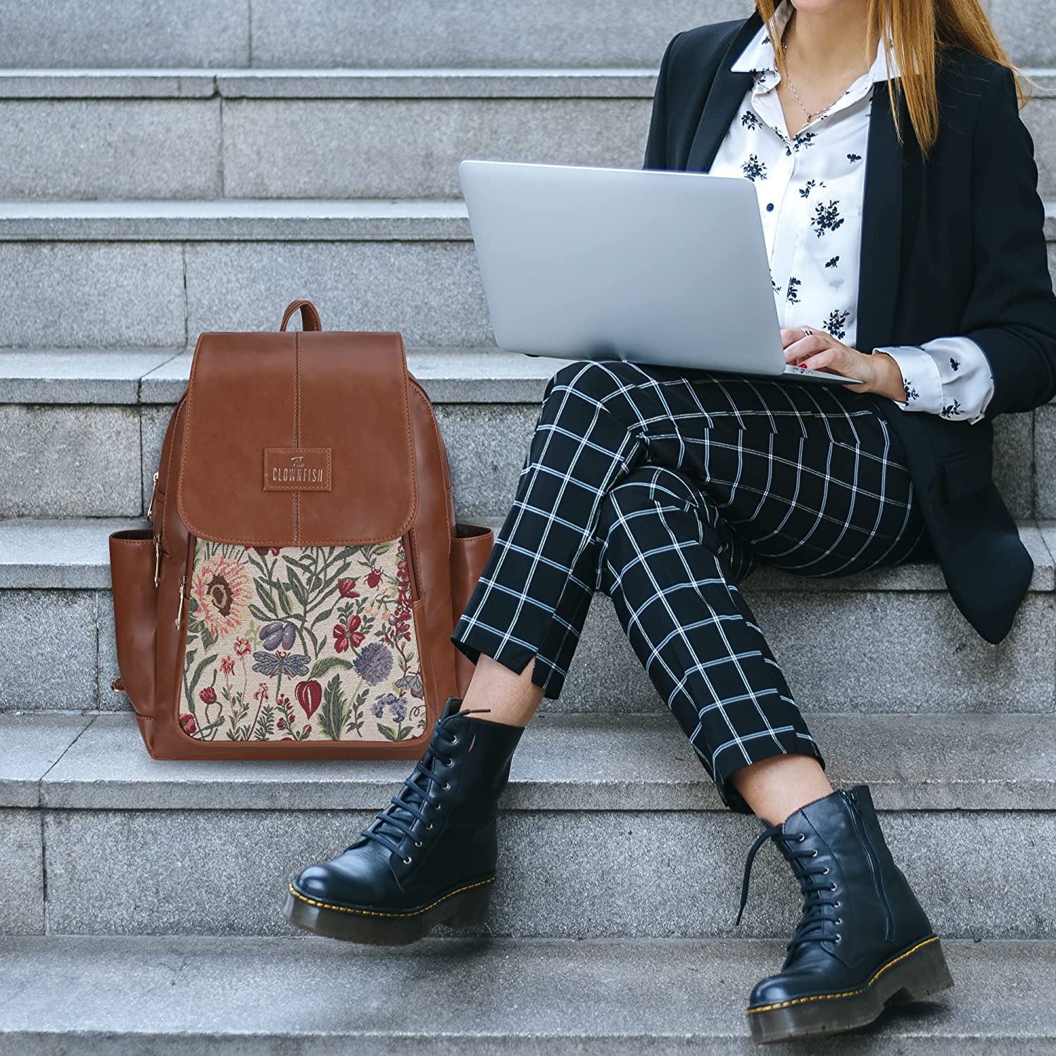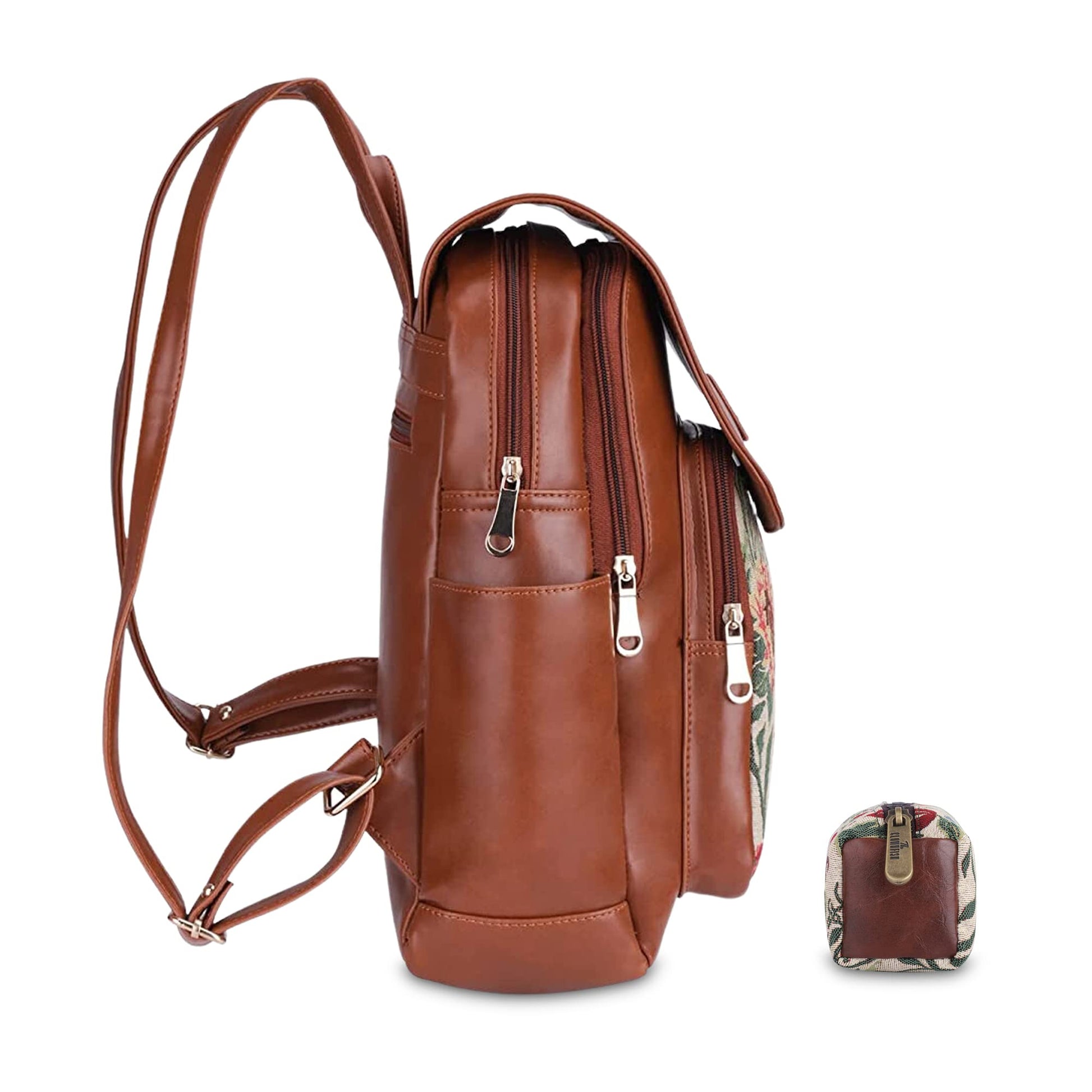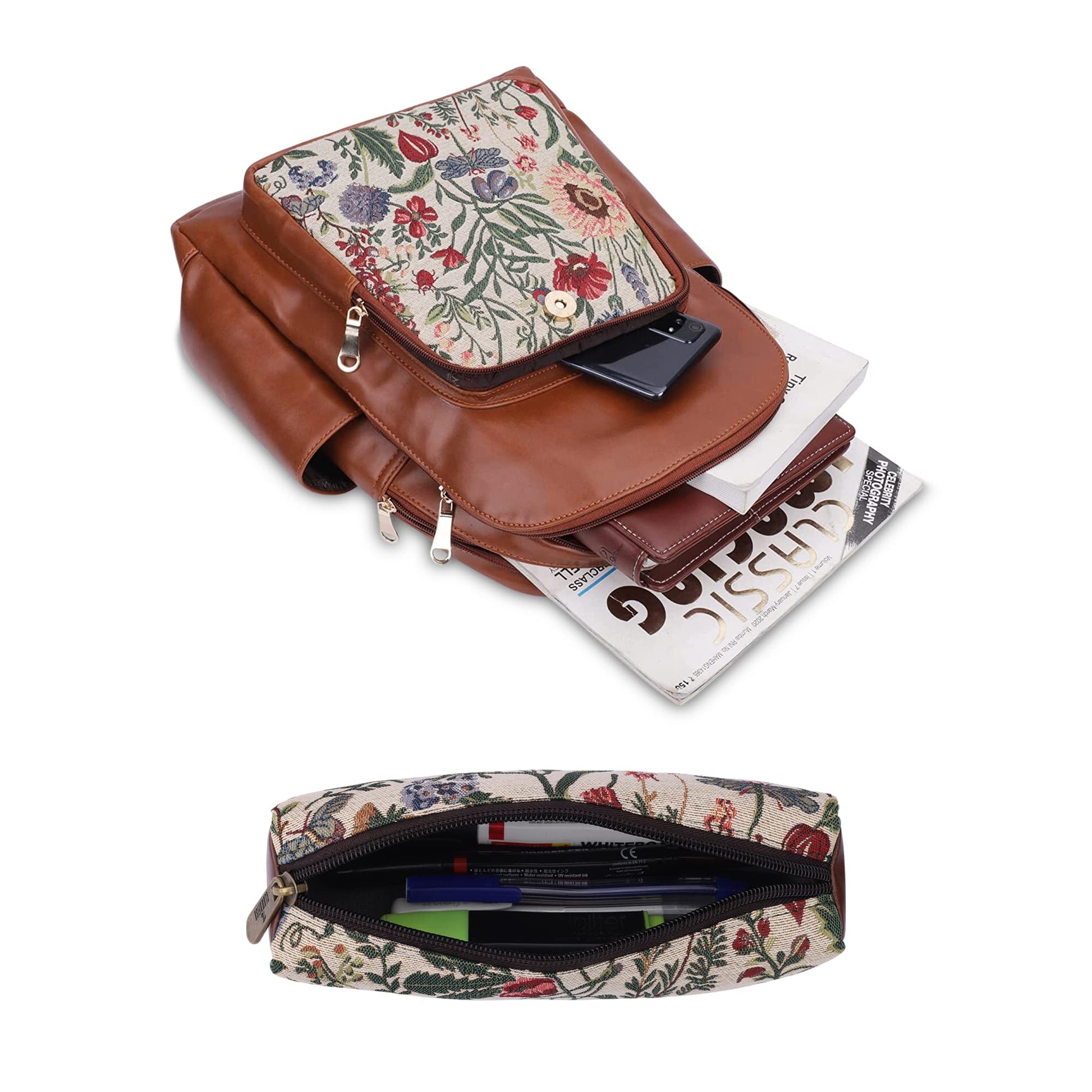 - PREMIUM MATERIAL: This combo of womens backpack & pencil pouch is made from combination of Faux leather & Tapestry fabric. For the inner lining soft feel polyester fabric is used. Comes with durable reinforced stitching and fittings like zippers, pullers, snap buttons.