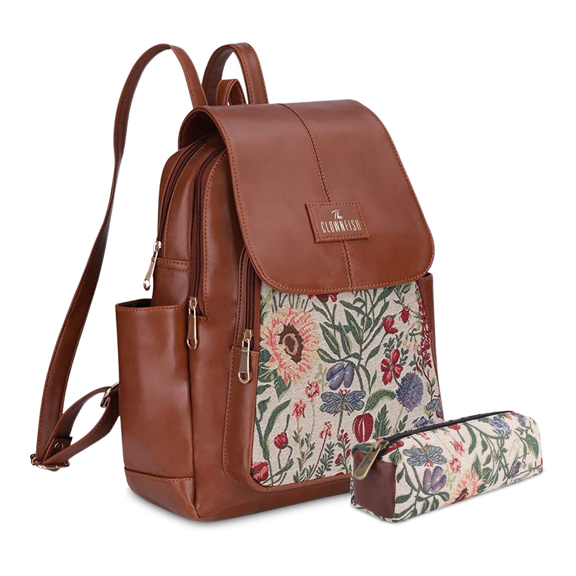 THE CLOWNFISH Combo Of Minerva Faux Leather&Tapestry Women's Standard Backpack College School Girls Bag Casual Travel Standard Backpack For Ladies&Expert Series Pencil Pouch Pen Case(Flax),10L,Multi
