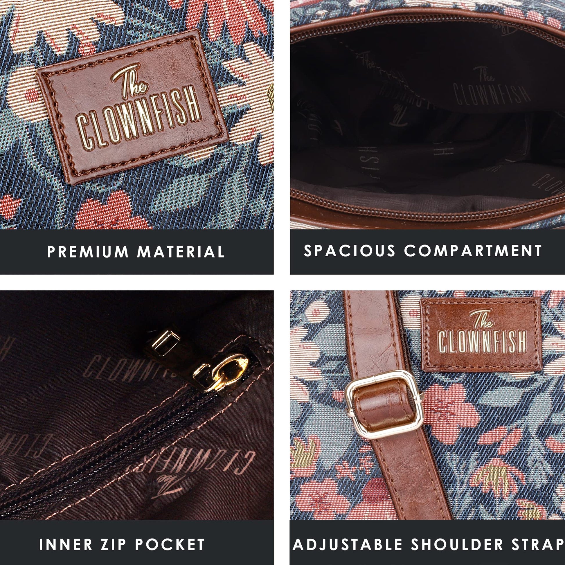 - PREMIUM MATERIAL: This sling bag is made in a combination of premium faux leather and Tapestry material. For the inner lining soft feel polyester fabric is used. Comes with durable reinforced fittings like zippers, buckles.and hooks