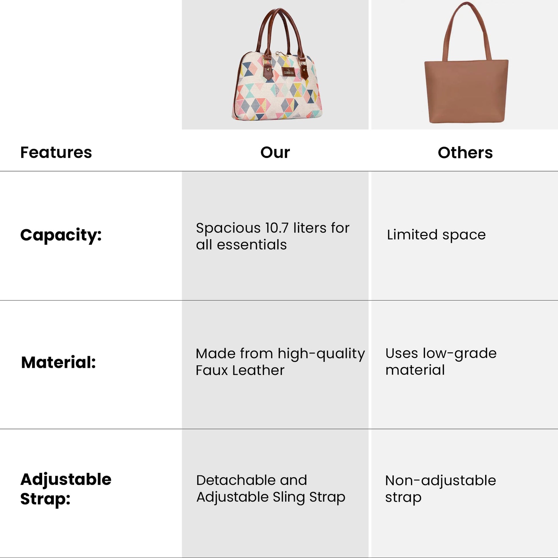 - STRUCTURE & DESIGN: This bag is perfectly designed with one spaced compartment to store all office accessories or personal cosmetics and other essentials for women or college going girls. The internal zip pocket for cash, wall etc. Small open pocket for storing mobile. The double grab handle is sturdy enough to take the weight.
