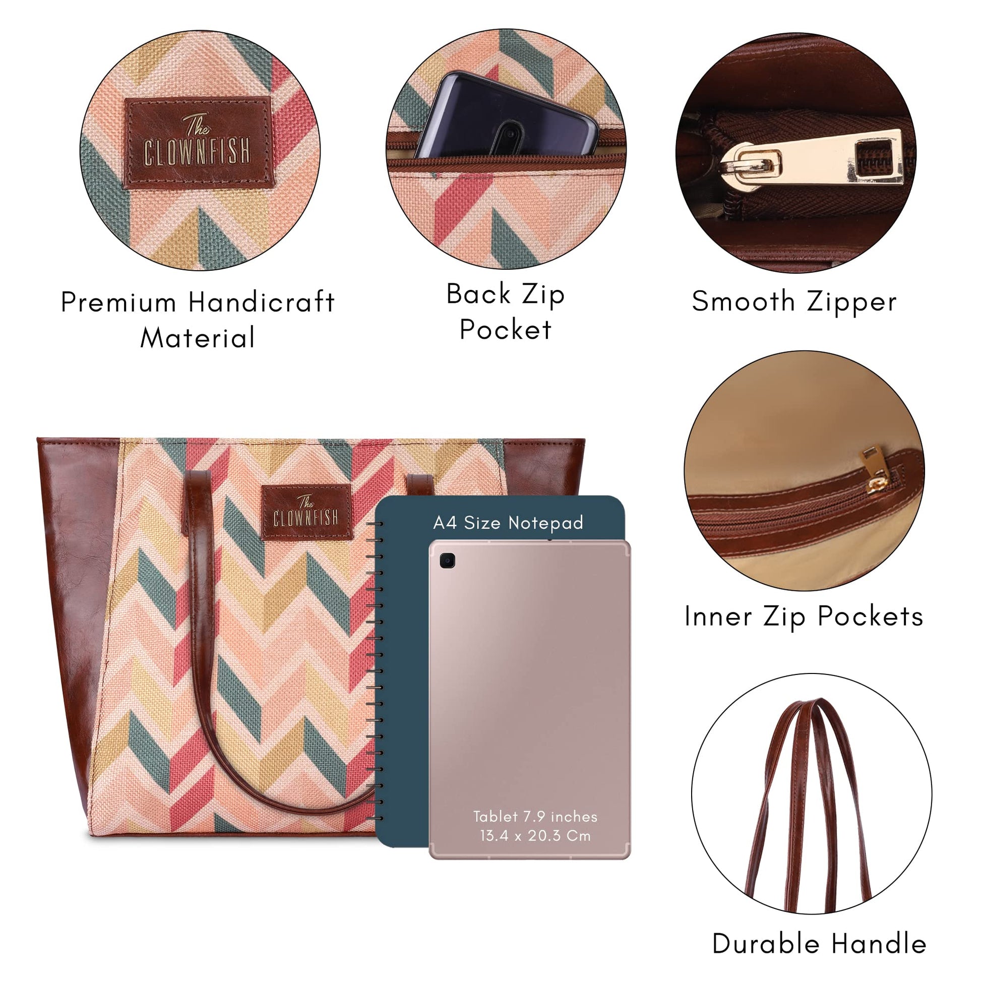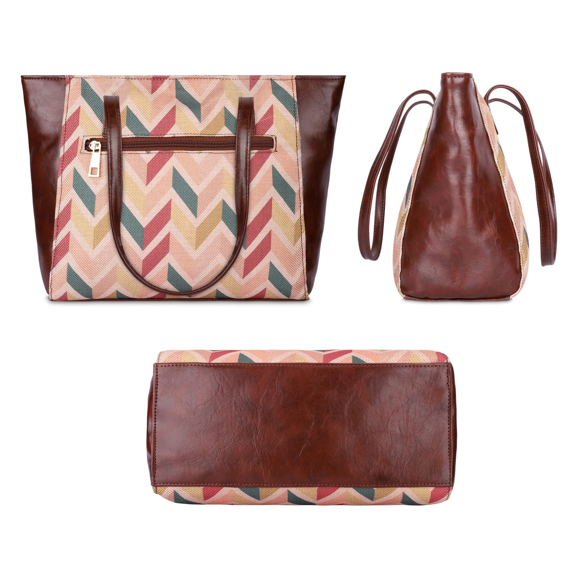 THE CLOWNFISH Valentine Printed Handicraft Fabric & Faux Leather Handbag for Women Office Bag Ladies Shoulder Bag Tote for Women College Girls (Cream-Wave Design)