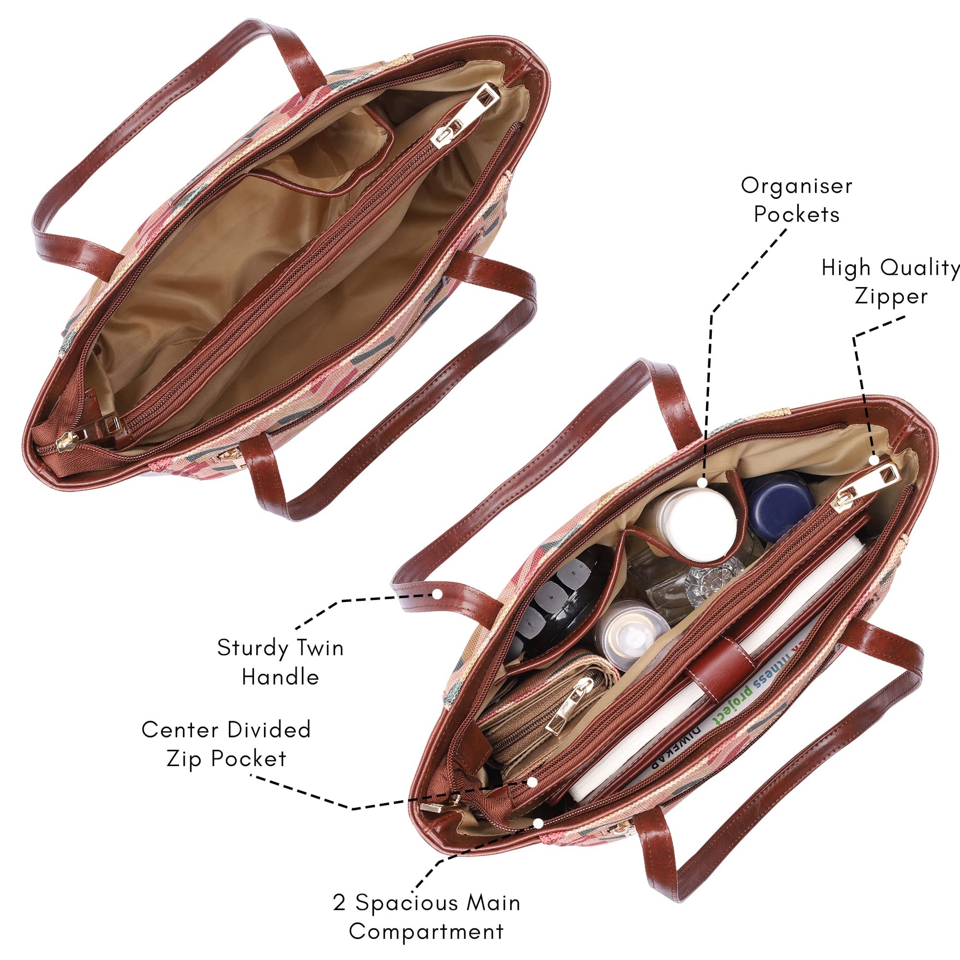 - PREMIUM MATERIAL: This handbag/tote bag is made from combination of premium Printed Handicraft Fabric and Faux leather. For the inner lining soft feel polyester fabric is used. Comes with durable zippers & pullers. The twin handle is sturdy enough to take the weight of the bag.