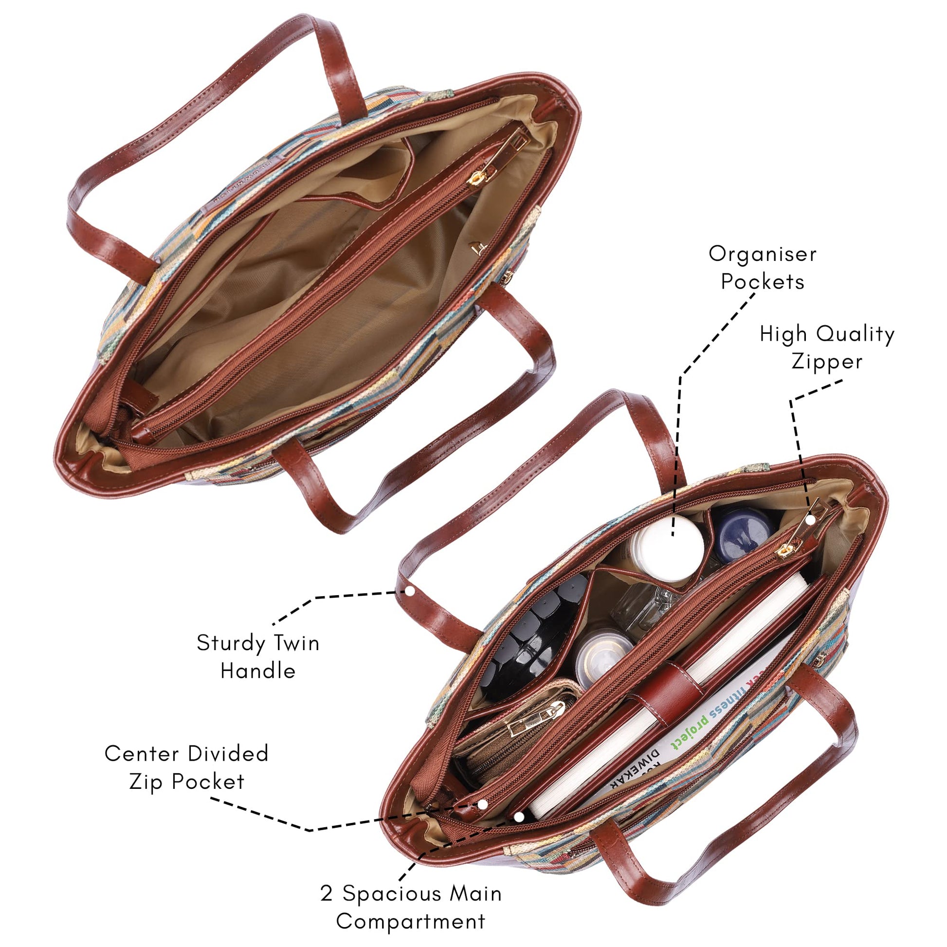 - PREMIUM MATERIAL: This handbag/tote bag is made from combination of premium Printed Handicraft Fabric and Faux leather. For the inner lining soft feel polyester fabric is used. Comes with durable zippers & pullers. The twin handle is sturdy enough to take the weight of the bag.